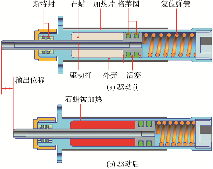 石蜡驱动器是当前空间非火工驱动器技术领域的研究热点,现有的空间石蜡驱动器主要采用弹性鞘挤压原理,具有摩擦力大、驱动力小等问题。本文针对这些问题,发展了活塞式空间大载荷石蜡驱动器,该驱动器通过活塞结构有效增大了石蜡液压对驱动杆的作用面积,大幅提高了驱动力;通过双层密封设计和复位弹簧设计,确保了驱动器的密封及复位性能。为了验证该方案,完成了原理样机的制造,开展了摩擦力测试、功能测试、寿命测试等试验。结果表明,采用载荷范围为85~165 N的复位弹簧能推动活塞克服系统摩擦力进行复位,保证了驱动器的自动复位功能;在额定功率40 W(额定电压12 V)下,驱动器的输出位移为6.9 mm,响应时间为20 min,驱动力超过300 N。寿命试验表明,该驱动器寿命超过100次,多次输出位移稳定性好(7 mm左右波动);驱动器密封性能优秀,经历100次作动后,未发现石蜡泄漏。