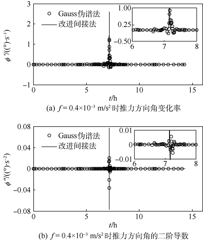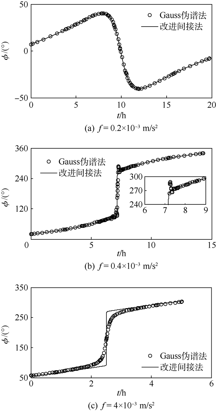 针对常值推力下航天器面内轨道转移燃耗最省的轨道优化问题,利用极大值原理导出了最优轨迹下推力方向角应满足的控制方程,结合动力学方程建立了一种求解航天器面内最优转移轨道的改进间接法,及其在推力方向角调节能力受限条件下的应用方法。由于避免了协态变量微分方程组的求解,改进间接法相对于传统间接法降低了初值猜测的难度和计算量;与采用Gauss伪谱法求解相比,所建立的改进间接法求解结果精度更高,数值光滑性更好。仿真算例表明:推力方向角调节能力受限会改善推力方向角变化规律,降低推力方向角变化范围;就燃耗而言,推力越大燃耗越多,优化轨道节省燃耗更加显著。