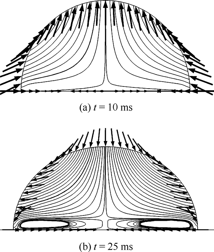 针对液滴铺展和移动的动力学行为在工业生产和微流控芯片等领域有着重要作用,提出了一种基于超声行波理论的弹性体平板驱动模型,利用压电陶瓷的逆压电效应在弹性体玻璃产生超声行波从而驱动液滴运动。借助多物理场软件COMSOL建立液滴模型,首先进行行波分析,验证了驱动液滴的可行性。在0~60 ms中,液滴在超声行波的驱动下进行收缩-铺展的正弦振荡运动。然后通过液滴内部流场结构分析发现,当液滴半径铺展到最大后开始收缩时,液滴与基底接触面处的速度首先发生变化,表明液滴内部速度场的变化对接触线是否发生移动有着重要作用。液滴内部流场存在一个类似于椭圆形的漩涡,说明液滴运动不是单纯由于收缩-铺展而引起的平动,而是滚动着朝前运动。最后分别探讨了液滴移动速度与驱动电压、驱动频率以及动力黏度的关系,结果表明液滴移动速度受动力黏度影响较为显著。