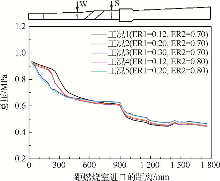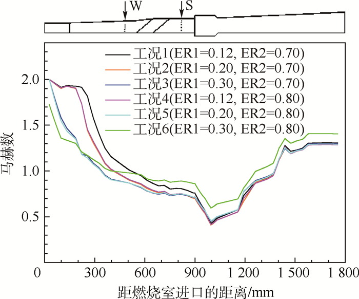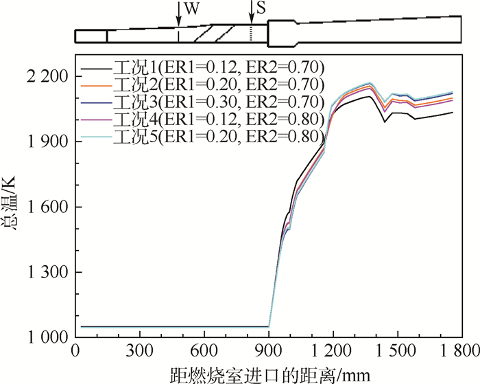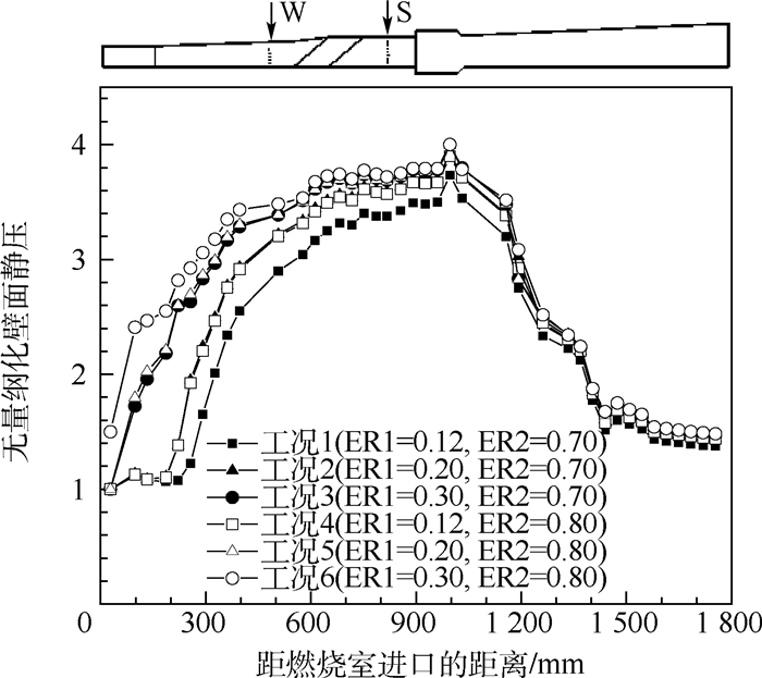 在纯净空气来流条件下,对于全高后掠支板与凹腔耦合的燃烧室,采用分级喷射供油,对比研究了壁面喷射当量比对壁面压力和燃烧性能的影响。结果表明:在支板喷射当量比一定的情况下,随着壁面喷射当量比增加,壁面静压峰值升高,静压开始提升的位置向上游移动,总当量比达到1.1时发生溢流;一维分析表明,马赫数在支板附近降到1以下,在凹腔处达到0.5左右,在出口扩张段恢复至1以上,燃烧室处于亚燃模态;燃烧性能方面,保持支板喷射当量比一定,随着壁面喷射当量比的增加,总压恢复系数提高,出口总温增加,燃烧效率降低。