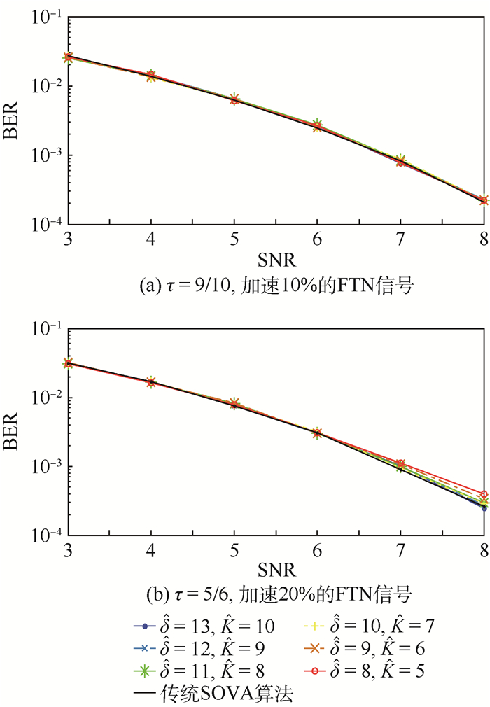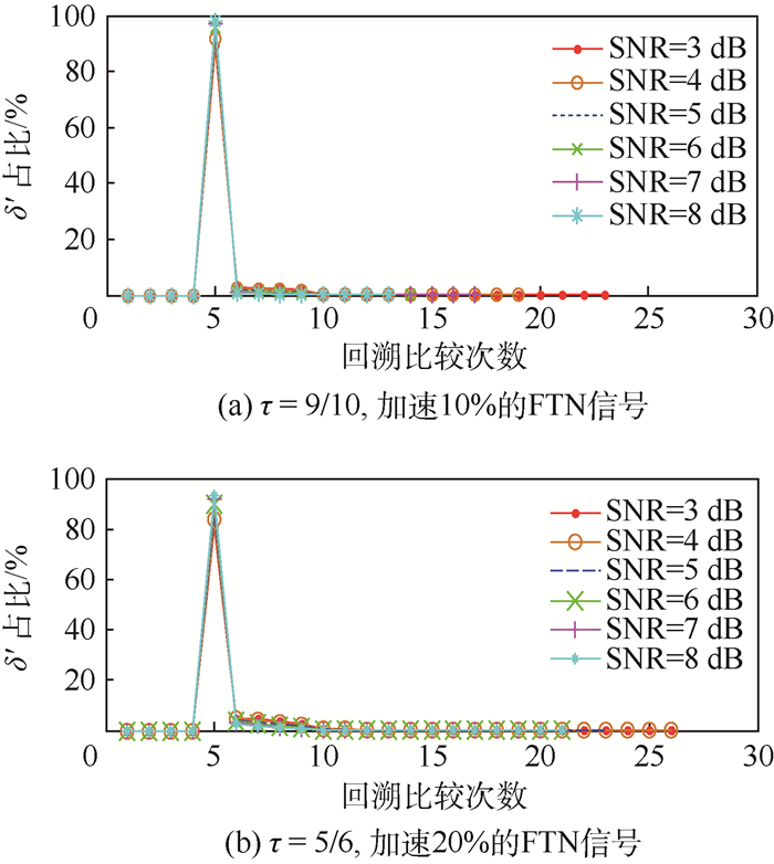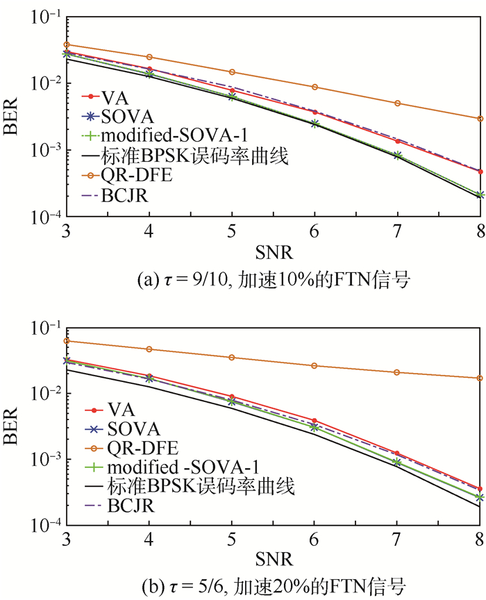 超奈奎斯特(FTN)传输技术是一种高频谱效率的信号传输方式。针对FTN信号存在的码间串扰,基于软输出维特比算法(SOVA)提出FTN信号的低复杂度接收算法。根据幸存路径和竞争路径的判决结果,动态地调整每个时刻回溯过程的比较次数,降低比较次数平均值。在实际应用中,根据不影响误码性能的统计经验值直接截短回溯路径的长度。直接截短回溯深度算法可在不恶化误码率(BER)的前提下,降低比较运算次数2/3,同时减少回溯过程所需寄存器资源和延时50%以上。