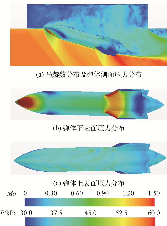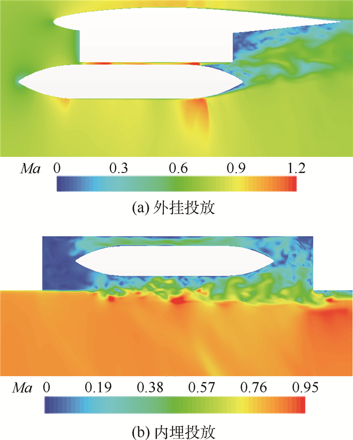 为了研究弹体外挂投放与内埋投放的区别,利用基于Menter SST湍流模式的改进延迟分离涡模拟(IDDES)方法以及重叠网格技术,分别对亚声速和超声速来流条件下,同一弹体外挂投放和内埋投放进行了数值模拟,得到了亚声速和超声速条件下外挂投放与内埋投放弹体的下落规律。通过对比分析表明:亚声速和超声速来流条件下,内埋投放由于受舱体内强非定常流场以及舱体唇口剪切层的影响,弹体受很大的抬头力矩,弹体姿态角变化较大,投放特性劣于外挂投放。进一步研究表明:在弹射时给弹体一定的低头角速度,使弹体以低头姿态穿越剪切层,则可以大幅度降低剪切层带来的不利影响,提高内埋投放弹体分离品质。