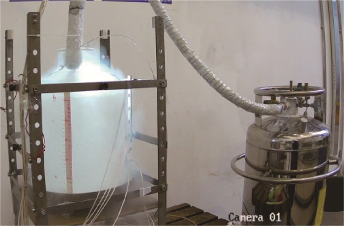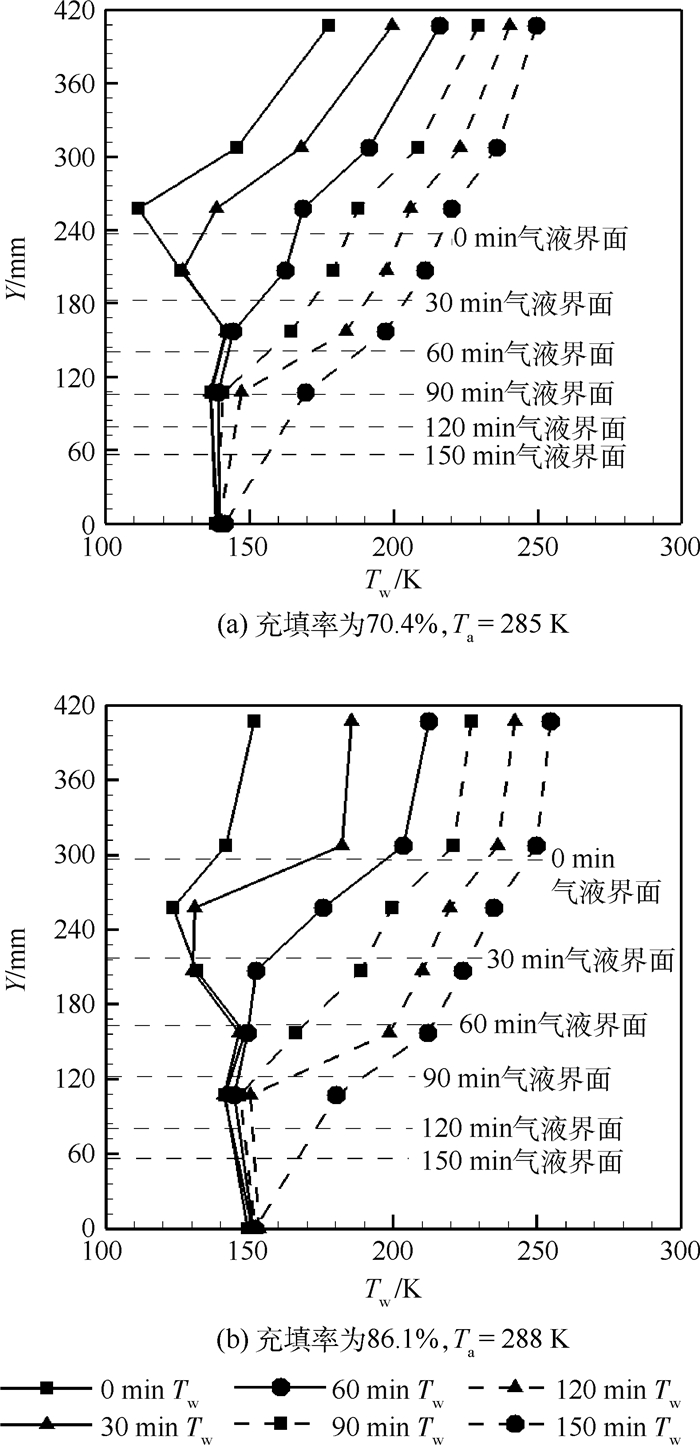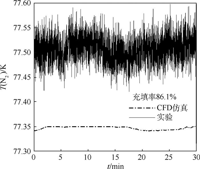 为研究低温推进剂的常压停放过程,设计了可视化液氮贮箱实验系统。实验中研究充填率和环境温度对液氮汽化量的影响,并测量贮箱内流体和贮箱外壁面的温度随时间和位置的变化。实验得出贮箱常压停放过程,相变主要在壁面和气液界面产生,并且气枕区存在温度分层,距出口位置越近温度越高;而液体区温度基本一致,处于饱和状态。贮箱外壁面在轴向的温度分布显著不同,处于液体区壁面温度低。运用分子动力学推导出的Hertz-Knudsen公式作为气液相变的传热传质源项,并据实验测得温度边界条件,采用混合物模型对贮箱常压停放状态进行30 min的数值仿真。仿真得到结果显示体积汽化速率与实验数据的偏差在5%以内,液体区的温度仿真与实验的偏差在0.15 K左右。