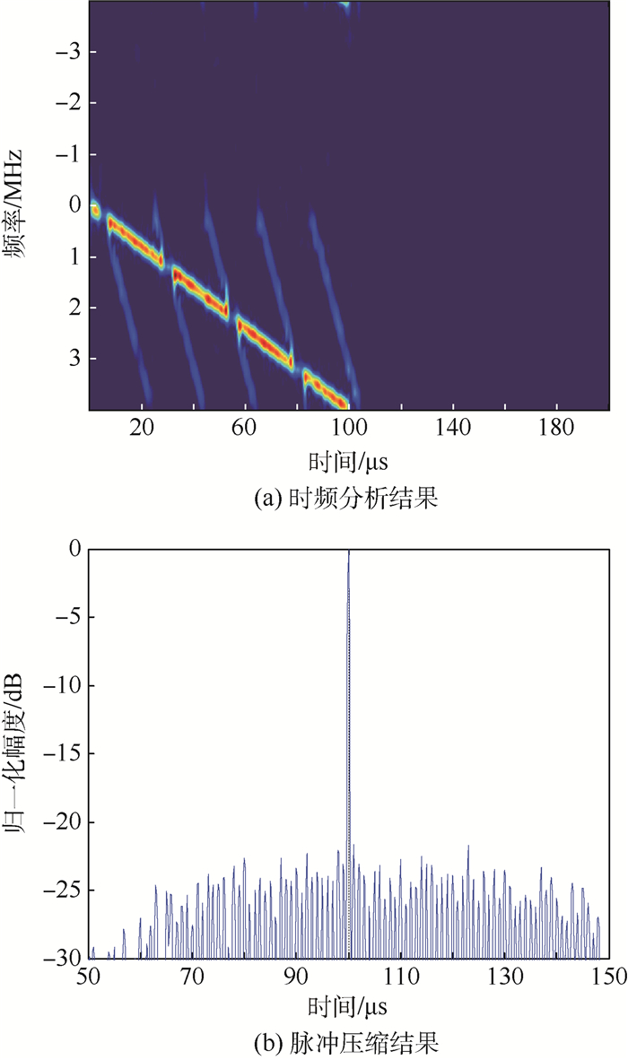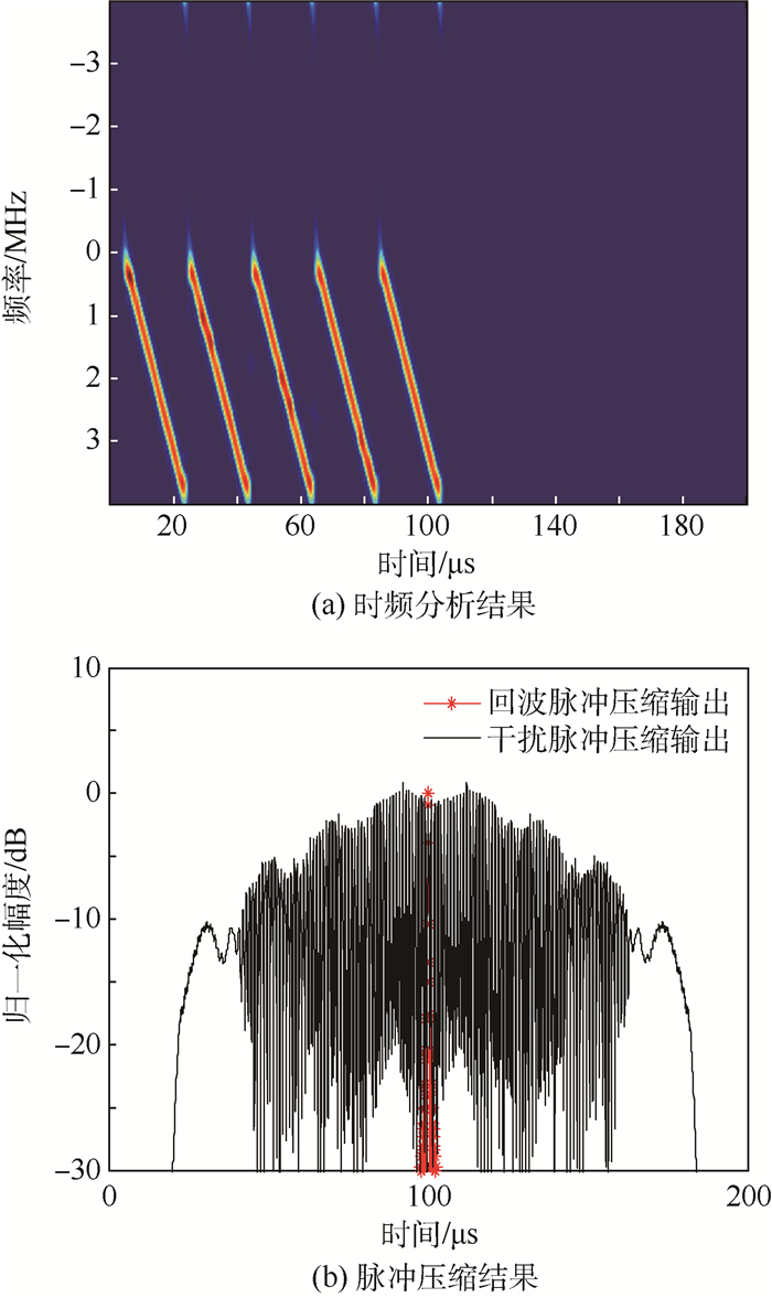频谱弥散(SMSP)干扰是一种针对线性调频(LFM)信号的相参压制干扰。根据SMSP干扰子脉冲的周期特性,提出了一种基于干扰重构和峭度最大化的干扰抑制方法。首先,利用自相关方法估计干扰子脉冲的周期,并根据干扰的产生原理确定子脉冲调频斜率,即可重构相位未知的干扰子脉冲;其次,对重构的干扰子脉冲分别设定不同的相位,并与接收信号做共轭相乘,根据相乘的结果确定干扰信号的初相位;最后,利用峭度最大化原理,确定干扰抑制因子,实现干扰抑制。仿真结果表明,本文方法能够有效实现干扰抑制,经过干扰抑制后的信干比可达20 dB以上,并且在存在噪声和相位误差的情况下,仍能够保持较高的信干噪比增益。