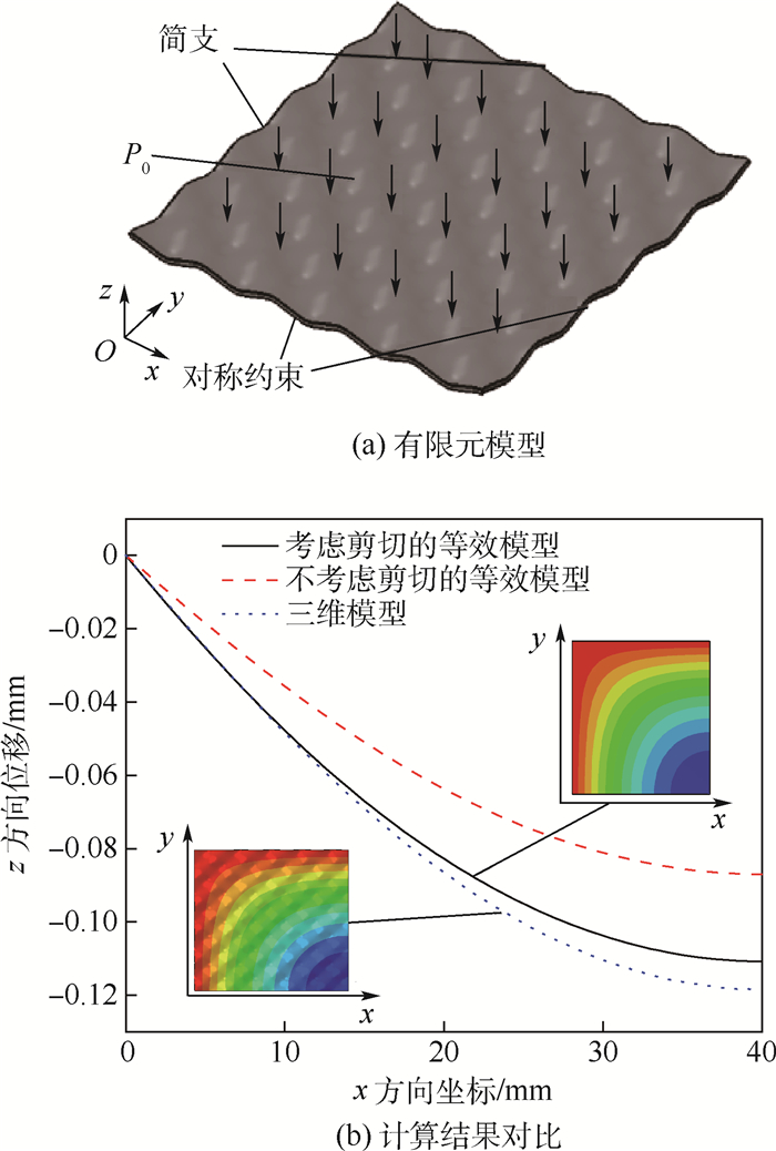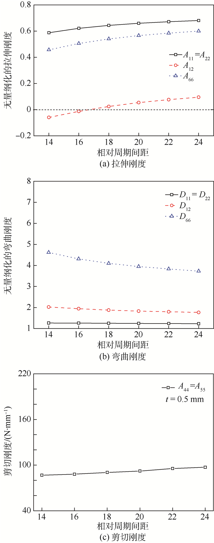 为了得到波纹板的宏观刚度特性及其与表面形貌结构参数的关系,基于单胞有限元的方法对波纹板的等效刚度特性进行了研究。首先,基于单胞有限元的周期性边界条件,计算了具有周期性排布特点的波纹板的等效刚度;然后,计算了典型形貌波纹板的等效刚度特性,并进行了分析和验证;最后,运用单胞有限元的方法分析了波纹板结构参数对等效刚度特性的影响。分析结果表明:采用单胞有限元的方法可以有效计算波纹板的等效刚度;波纹板相较于基础薄板具有更高的弯曲刚度,但拉伸刚度和剪切刚度较低。当基础薄板厚度固定时,随着波纹板相对厚度的增加,拉伸刚度和剪切刚度降低,弯曲刚度升高;随着波纹板波纹相对周期间距的增加,拉伸刚度和剪切刚度升高,弯曲刚度降低。
