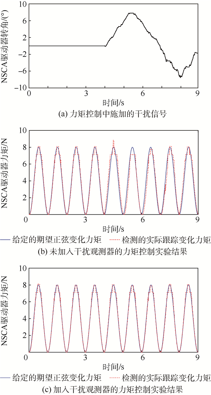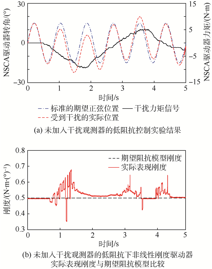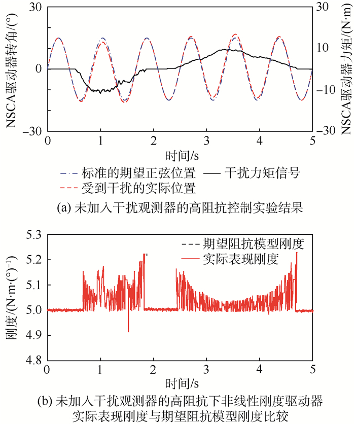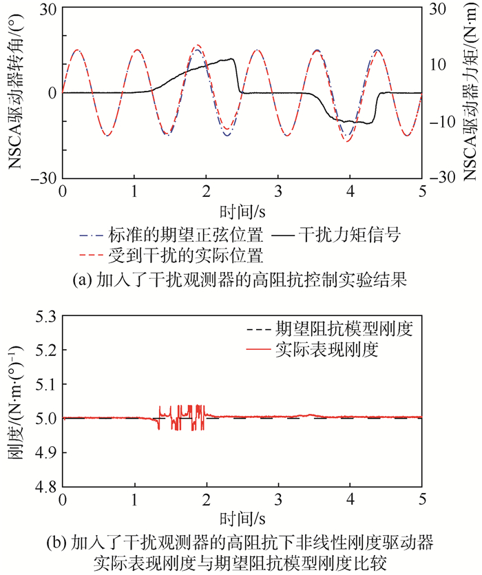 基于“小负载,低刚度;大负载,高刚度”的非线性刚度驱动器(NSCA)优化了可变刚度驱动器(VSA)的工作区间,具有交互力小时力分辨率高,交互力大时响应速度快的优点。但在复杂的人机交互控制过程中,由于难以对干扰和噪声建立准确的数学模型,故而严重影响到系统的控制精度。因此,本文利用基于观测估计干扰并实施补偿的干扰观测器(DOB)解决非线性刚度驱动器的此类问题。首先,根据非线性刚度驱动器动力学模型建立了控制系统状态方程以及干扰观测器,利用李雅普诺夫方法分析系统稳定性并给出了稳定条件;然后,根据该稳定条件将干扰观测器算法应用于非线性刚度驱动器控制系统中得到实验数据。最后,实验结果表明,采用干扰观测器算法将非线性刚度驱动器在阻抗控制模式下的刚度误差降低了85.71%,大幅度提高了驱动器控制精度。