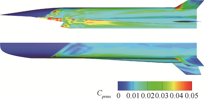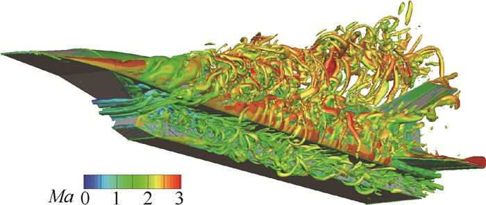 针对类X-51A飞行器在超声速大迎角状态下存在的大范围非定常分离流动,开展了精细化湍流数值模拟研究。计算基于高阶格式下的延迟分离涡模拟方法(DDES),来流马赫数为2.5,迎角为10°。分析了该复杂流场中存在的分离流动现象、分离流动诱导的气动特性变化规律以及压力脉动特点;其中重点研究了壁面压力脉动强度分布情况和监测点压力脉动频谱特性。分析结果表明:飞行器大迎角飞行时从侧缘诱导出明显的分离涡,并对尾部舵面产生干扰;受干扰尾舵表现出明显的非线性及非定常气动特性;分离涡的存在导致飞行器尾舵前缘等位置的壁面压力脉动显著增强,200~300 Hz的低频高幅值脉动可能会导致结构破坏。