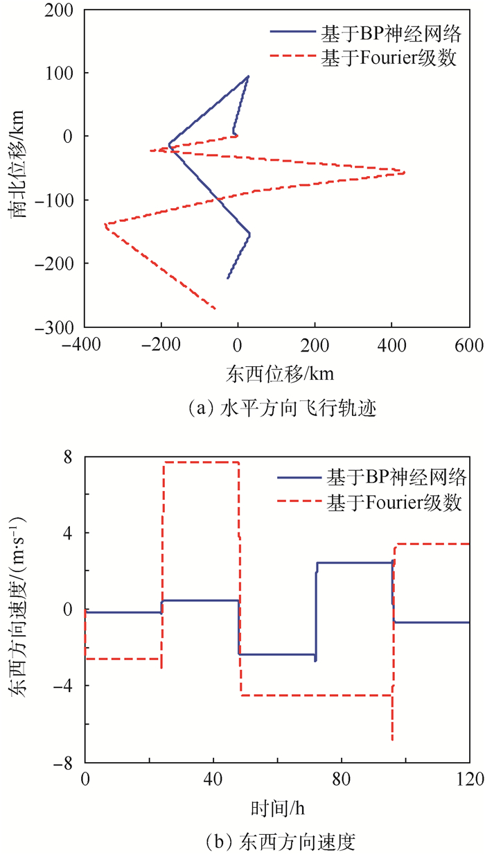 平流层风场环境对浮空器设计和轨迹控制具有重要影响。针对平流层风场建模,以长沙地区2005—2010年的风场数据为例,首先采用本征正交分解(POD)方法对风场数据进行降阶处理;然后分别采用Fourier级数与BP神经网络算法对平流层风场进行预测,并对2种模型的预测精度进行比较分析;最后通过建立临近空间浮空器的动力学模型和高度调控模型,分析2种风场预测模型对浮空器轨迹控制的影响。研究结果表明,相对于Fourier预测模型,基于BP神经网络预测模型的预测精度更高,可信度更强,能够更好地为浮空器飞行轨迹控制提供参考价值。
