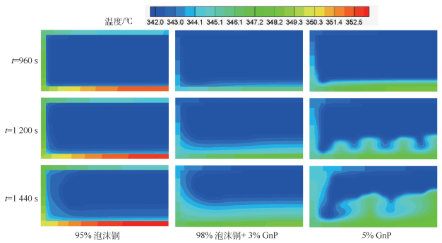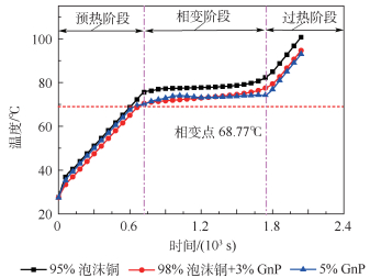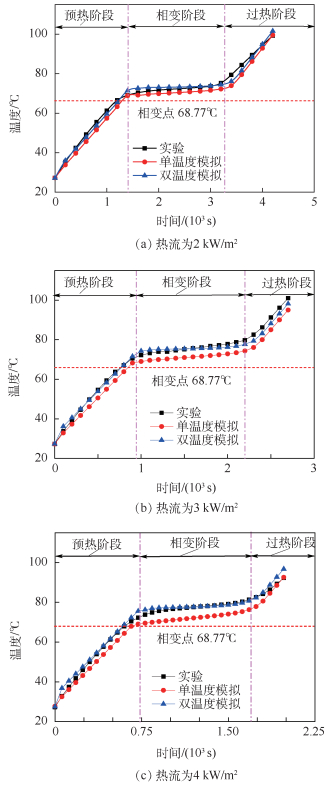 固液相变储能材料的被动热沉广泛应用于航空航天及军事装备领域。针对高热流密度电子芯片的被动温控问题,对比实验验证了单温度和双温度2种数值模拟方法对基于泡沫铜/硬脂酸复合相变材料被动热沉控温过程模拟的准确性。结合基于Maxwell-Garnett模型的EMT建立了石墨烯纳米片/硬脂酸复合相变材料物性,采用更为精确的双温度数值模拟方法分析了不同导热强化方式的控温效果,并研究了环境温度对热沉控温效果的影响。结果表明:高热流密度下的相变温控过程采用双温度数值模拟更为精确;当导热增强体的体积组分相同时,提高泡沫金属的孔密度对相变温控效果提升有限,而同时采用泡沫金属与石墨烯纳米片能更有效改善相变控温效果;环境温度的剧烈变化对温控时间和控温温度均能产生影响。