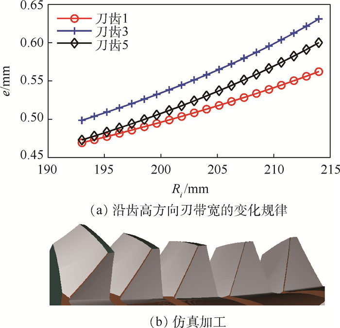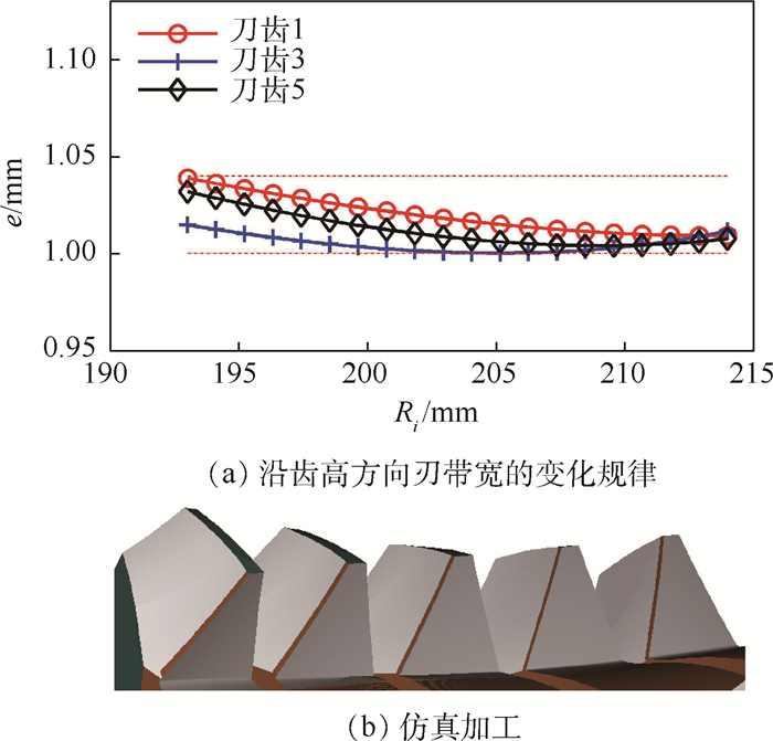 环面蜗轮滚刀刃带面的刃带宽需控制在一定的范围内以保持刃口的强度和锋利性,圆周定位误差的存在使刃带宽发生变化。为了磨削出满足需要的刃带面,研究了周向定位误差对刃带宽的影响规律。根据微分几何和齿轮啮合原理,建立了求解含有周向定位误差的刃带宽的数学模型。研究了存在周向定位误差时,刃带宽沿环面蜗轮滚刀的轴向和齿高方向的变化规律。同时,在VERICUT中建立虚拟的四轴联动环面蜗杆磨床,对周向定位误差的影响进行仿真验证。研究结果表明:周向定位误差对环面蜗轮滚刀边齿齿顶处刃带宽的影响最大;刃带宽与周向定位误差具有很强的相关性,呈线性变化关系;对于特定的算例,当给定的刃带宽e=1.0 mm在±10%范围内变化时,周向定位误差允许的调整范围为-0.122°~0.054°。