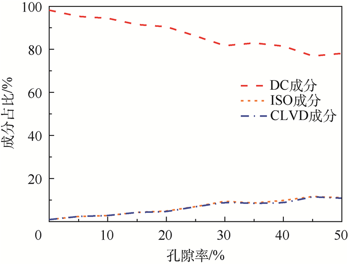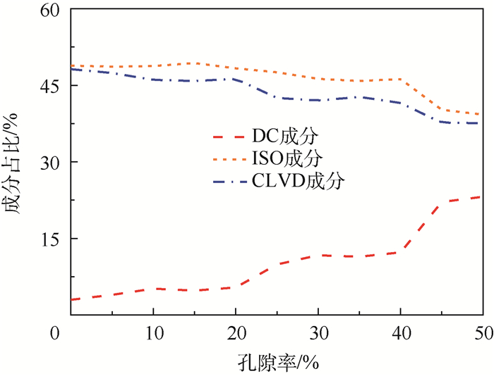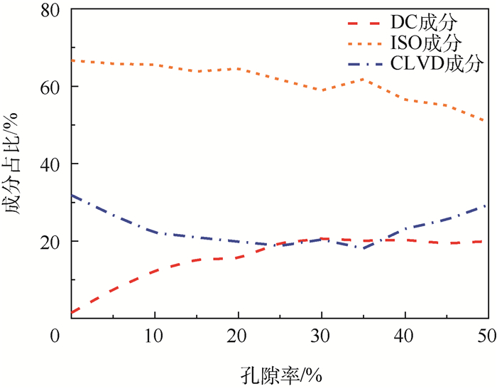 基于矩张量理论的动态裂纹扩展监测方法,利用裂纹开裂产生的声发射信号获取裂纹开裂信息,而介质中的孔隙结构会影响监测结果的准确性。使用二维平面应变有限单元方法(FEM)建立孔隙分布数值模型,给出特定裂纹在不同孔隙率介质下的反演结果,并分析其成因。数值结果表明,双力偶成分对孔隙率的敏感度最高。对于纯剪切裂纹,反演结果中双力偶成分的占比随孔隙率的增大而减小;对于面内各向同性和拉伸裂纹,双力偶成分的占比随孔隙率的增大而增大。原因是孔隙结构对弹性波的散射导致弹性波幅值的空间分布发生变化,效果体现在两方面:一方面,能量转移作用导致不同传播方向弹性波的幅值趋于接近;另一方面,孔隙分布的差异导致临近传播方向的弹性波幅值差异增大。两种影响因素的权重差异导致不同裂纹的反演结果受孔隙的影响不同。