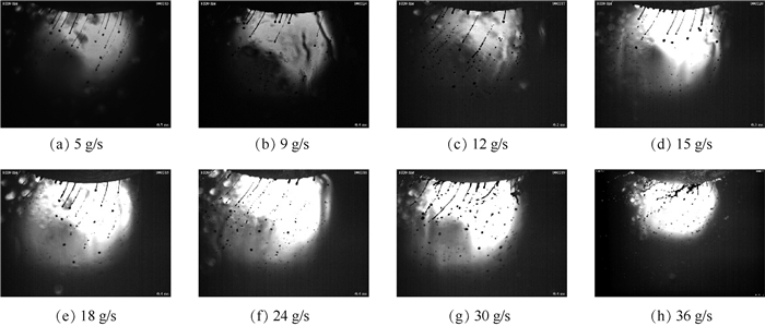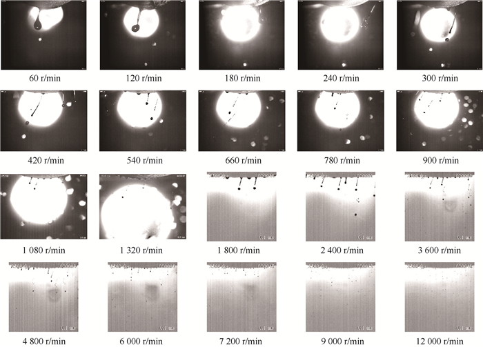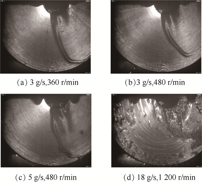 为了解重力对旋转圆盘表面液体流动的影响,利用高速摄影,对垂直旋转圆盘边缘液体形态进行了试验研究。结果表明,与水平旋转圆盘边缘液体分为直接液滴、液柱和液膜3种形态不同,垂直旋转圆盘边缘液体分为液柱、液膜和柱膜纠缠3种形态。垂直旋转圆盘底部与顶部液体形态并不一致。底部未出现液膜形态,当流量不大于24 g/s时,为液柱形态;当流量大于等于30 g/s时,为柱膜纠缠形态。当流量为12~21 g/s、转速为1 000~2 100 r/min,顶部出现液膜形态;当流量小于12 g/s时,顶部为液柱形态;当流量大于12 g/s时,液柱形态消失,由柱膜纠缠形态取代。由于重力影响,垂直旋转圆盘边缘液体形态变化程度远大于水平旋转圆盘;在流量大到一定程度后,圆盘底部形成液柱形态需要的转速会大大增加。