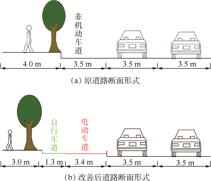 随着社会经济的发展与城市规模的扩张,城市交通需求大幅度增加,自行车和电力驱动非机动车数量急剧增加,与传统非机动车以及机动车的运行冲突显著。因此,探究非机动车系统运行特性,进而设计优化道路设施,建立新形势下安全、高效的绿色非机动车系统十分必要。首先,针对非机动车系统中的主要参与模式,即电动车与自行车之间的冲突以及共用非机动车道空间的局限性,提出了车道分隔设置以及车道平面抬升的核心改善思路;然后,针对非机动车道改善方案定量分析方法的缺失,提出了基于层次分析法和熵理论的定量指标评价体系及计算方法;最后,以焦作市非机动车系统为案例,分析其现状及主要问题,设计并评价改善方案的可行性和合理性。结果显示,某主干路非机动车道经过优化设计,其运行服务质量大幅提升,改善方案行之有效。对城市道路规划和城市道路断面设计以及改善后非机动车道的评价有积极的参考意义。