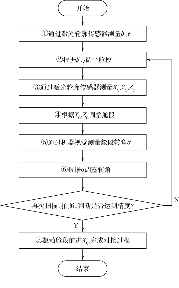 针对航天器舱段对接通常采用的手工操作方式效率低、精度差和可靠性难以保证的问题,研发了一种基于多传感器测量的舱段自动对接装置,其中舱体位姿的测量和调整是保证对接质量和效率的关键因素。提出了一种基于激光轮廓传感器和CCD图像传感器等多传感器协同测量的舱段六自由度位姿估计和调整方法。首先,采用激光轮廓传感器对舱体进行扫描,获取位姿三维点云信息,并采用改进的最小二乘法对被测舱段位姿进行求解;然后,通过CCD图像传感器获取舱段对接孔位置,通过圆拟合计算角度偏差,求解和拟合的结果将反馈至控制系统进行调姿和对接。采用Gocator 2350激光轮廓传感器及大恒MER-1810-21U3C工业相机进行舱体测量和对接实验,结果表明,舱体位姿调整精度和效率均达到对接要求。该方法结合了激光轮廓传感器的可靠性和机器视觉的灵活性,有效提高了自动对接系统的效率、稳定性和一致性,足以满足未来军用以及民用的需求。