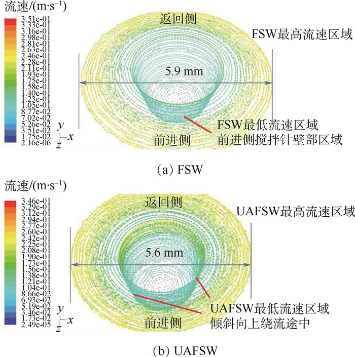为了探究超声能对铝合金搅拌摩擦焊(FSW)焊缝成型及焊缝缺陷的影响机理,采用数值模拟和试验验证相结合的方法,设计了同等工艺条件下的超声辅助搅拌摩擦焊(UAFSW)与搅拌摩擦焊的流场仿真和试验对比。通过分析2种焊缝横截面上热塑性金属的流动矢量和金相组织,研究了超声能导入后焊缝热塑性金属的流动变化情况。分析结果表明:超声能导入,使铝合金搅拌摩擦焊焊缝内金属的水平绕流方式演变成倾斜绕流方式,并使上下2个独立流场实现交汇统一,而且使焊缝金属最低流速提升近一个数量级,焊缝成型完整度明显增强,焊缝缺陷率大幅降低。