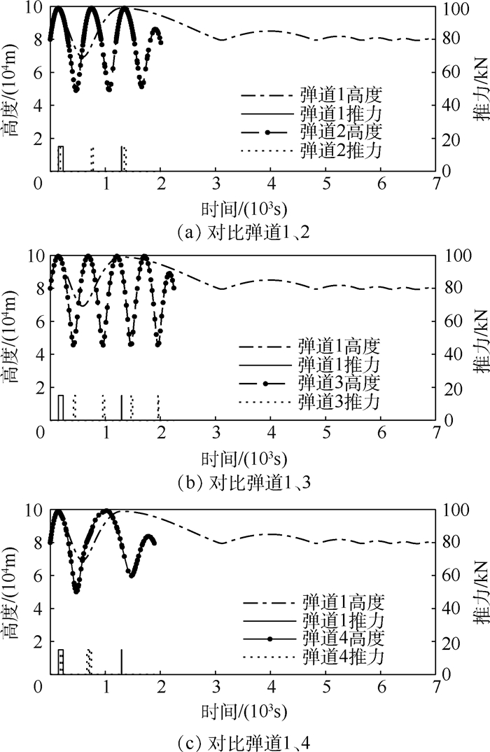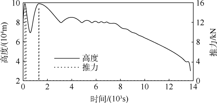 为研究飞行过程中的动力装置启动时刻及燃料消耗情况,对轨迹进行优化,进而提出一种动力增程型弹道的再入模式。推导Sanger弹道的解析解,分析得到高超声速飞行器再入航程最优所必须的迎角及初始速度取值条件等相关前提,利用该结论设计动力装置的启动方式使航程最远、燃料利用率最大。将轨迹设计为Sanger弹道和拟平衡滑翔弹道相结合的混合弹道:再入前期利用助推器间隔点火的方式形成等高类周期跳跃弹道以保证足够远的航程; 再入后期采用拟平衡滑翔弹道,将最优控制问题转化为复杂多约束非线性规划问题,性能指标综合考虑了轨迹平滑和航程。仿真实现了所提出的动力增程型再入弹道; 并在燃料充足、弹道倾角取值合适的条件下,得到“打水漂”弹道形式,该弹道能量损失极慢,具有足够远的飞行能力。仿真表明,与不同点火方式及求解方法得出的弹道相对比,所提动力增程型再入弹道具有3.47~3.84倍的航程、1.04~1.18倍的末端动能以及4.47~15.79倍的燃料利用率。