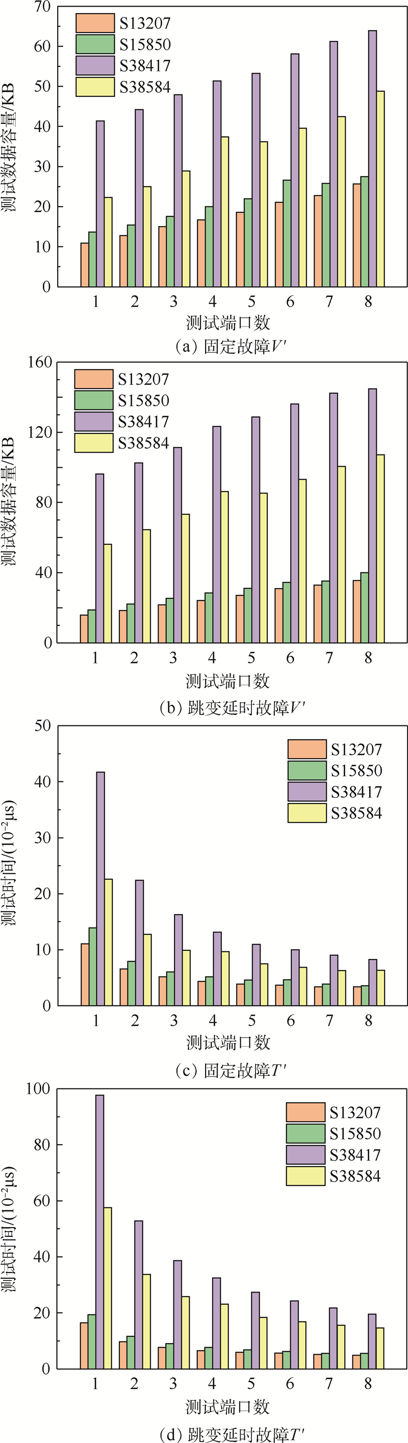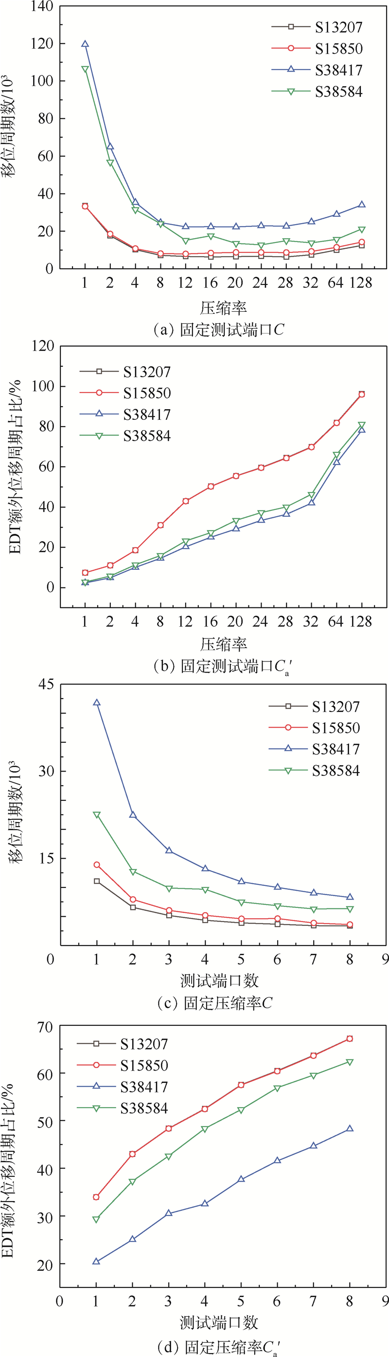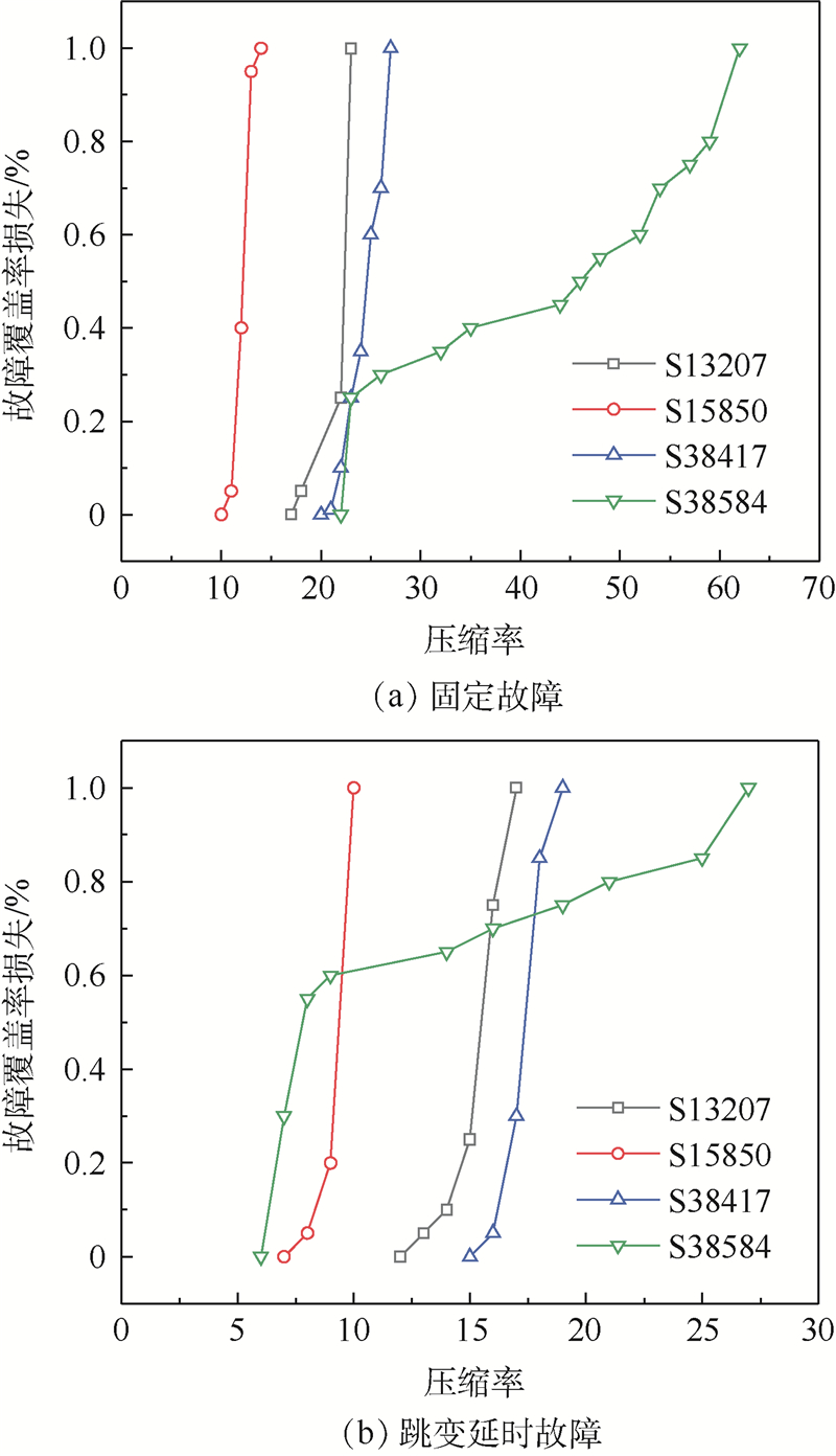 为了在集成电路可测试性设计(DFT)中实现更有效的测试向量压缩,减少测试数据容量和测试时间,采用嵌入式确定性测试(EDT)的扫描测试压缩方案分别对S13207、S15850、S38417和S38584基准电路进行了优化分析,通过研究测试向量和移位周期等影响测试压缩的因素,提出了固定测试端口和固定压缩率的扫描测试压缩电路优化方法。结果表明,在测试端口数量都为2,压缩率分别为12、14、16和24时具有较好的压缩效果,与传统自动测试向量生成(ATPG)相比,固定故障的测试数据容量减小了3.9~6.4倍,测试时间减少了3.8~6.2倍,跳变延时故障的测试数据容量减少了4.1~5.4倍,测试时间减少了3.8~5.2倍。所提方法通过改变测试端口数和压缩率的方式讨论了多种影响测试压缩的因素,给出扫描测试压缩电路的优化设计方案,提高了压缩效率,并对一个较大规模电路进行了仿真验证,可适用于集成电路的扫描测试压缩设计。