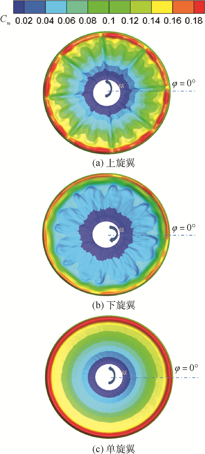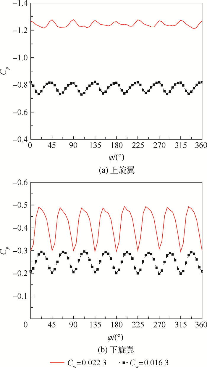 针对共轴刚性模型旋翼悬停状态,开展了桨叶表面压力测量试验与数值模拟研究。试验采用微型压力传感器进行桨叶表面压力测量,不仅获得了桨叶表面压力的试验数据,同时为CFD计算方法计算桨叶表面压力提供了验证数据。计算与试验结果对比吻合度良好,验证了CFD计算方法的有效性。研究获得了共轴刚性旋翼上下旋翼桨叶表面的流动情况和压力特性,结果表明:对于上下各4片桨叶的共轴刚性旋翼,桨叶表面压力随着桨叶旋转呈周期性变化,旋转一周出现8个小周期;在上下旋翼扭矩配平的悬停状态,下旋翼桨叶大部分区域受下洗流影响,下旋翼剖面拉力低于上旋翼;在桨尖区域,下旋翼的桨距角大于上旋翼,受各自上洗流的影响,下旋翼剖面拉力高于上旋翼。