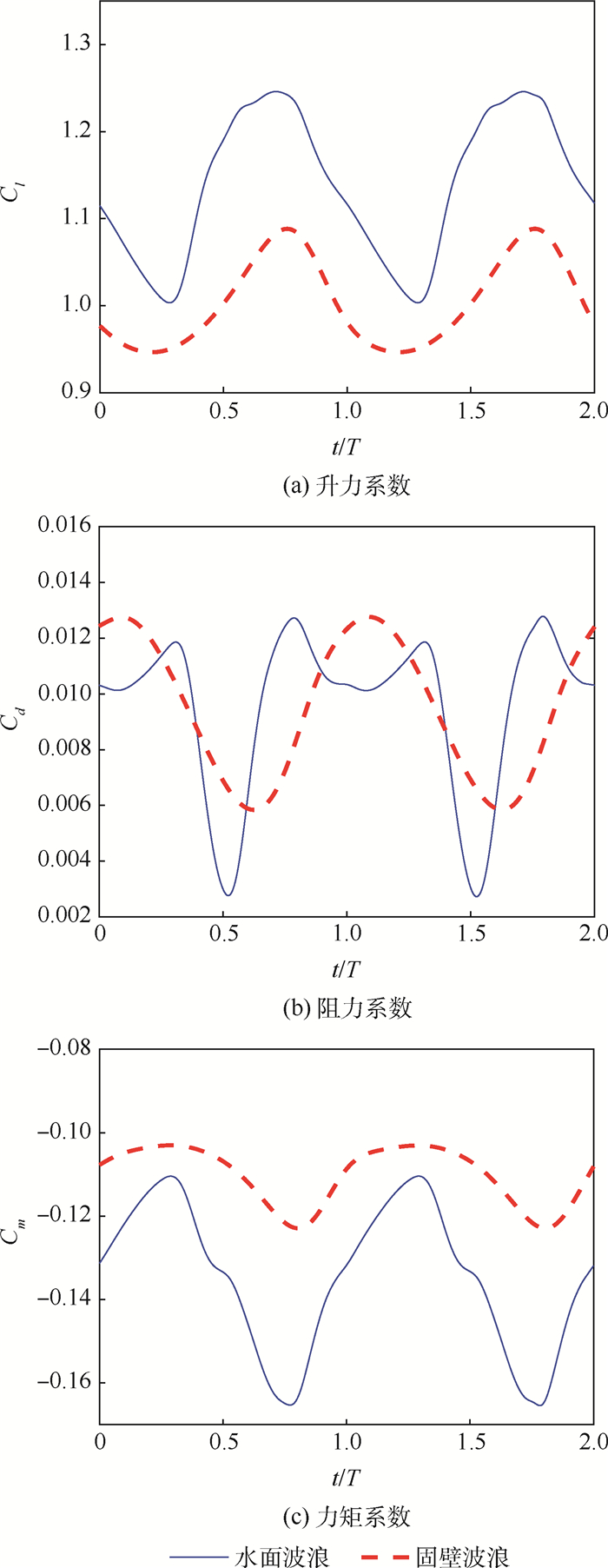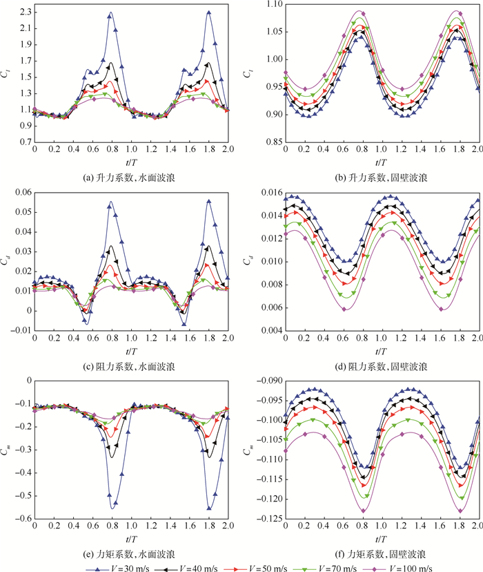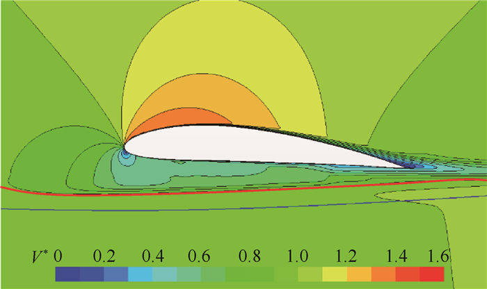 采用求解Navier-Stokes方程的数值方法研究了翼型NACA4412近距离经过波浪水面时的气动特性。对数值方法的准确性进行了验证。计算了翼型经过波浪水面和固壁波浪地面2种边界条件下的气动力系数,并进行了对比。研究结果表明:翼型在经过波浪水面时气动力系数会发生周期性的变化,与固壁波浪的情况相比,气动力的变化曲线存在显著差异,波动幅度更大。通过对流场结构的分析,发现了翼型和波浪水面之间的作用机理。波浪水面的质点存在竖直方向上的运动,在小地面间隙时,水面质点向上运动会挤压翼型和水面之间的空气,从而造成翼型气动力大幅波动。同时解释了来流速度越大,气动力系数波动幅度减小的原因。