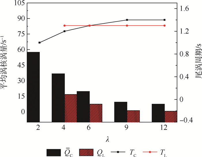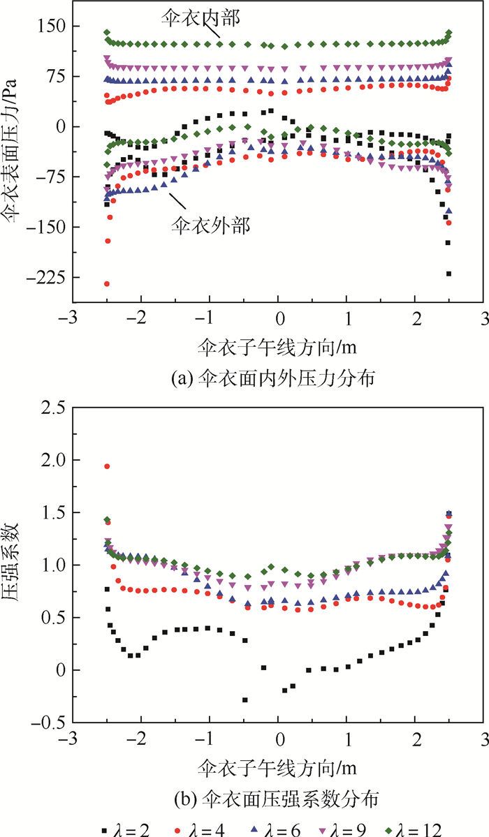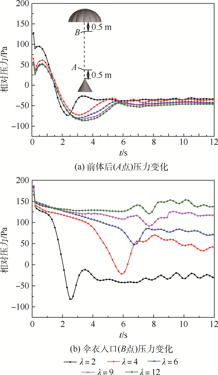 为研究前体尾流对降落伞工作性能的非定常影响,基于Realizablek-ε湍流模型采用PISO算法开展了物伞系统的非定常绕流数值计算,获得了精细的流场旋涡结构。在此基础上,研究了不同拖曳比下物伞系统的尾涡演变规律、流场分布规律以及伞衣气动特性变化。结果表明:前体尾涡导致伞衣入口处的涡量大小和方向时刻变化,随拖曳比增加,涡量黏性耗散增强,进入伞衣的旋涡强度逐渐减弱,伞衣入口形成稳定的负涡量区,伞衣尾涡脱离周期随之延长;拖曳比对尾涡区后端(伞衣入口处)流场压力的影响远大于前端,随拖曳比增加,流动形式逐渐由闭式转变为开式,流场的速度分布和压力分布更为对称,伞衣入口形成稳定的正压区,内外压差增加;当拖曳比大于9时,前体尾流对降落伞阻力系数和表面压强系数的影响减小。