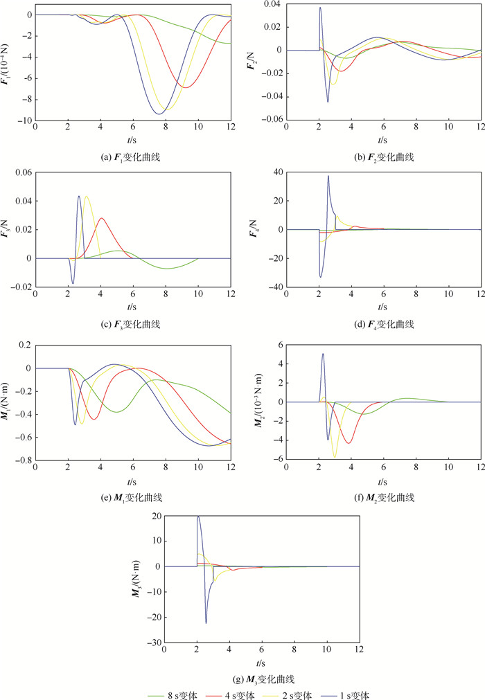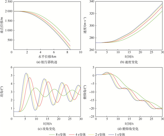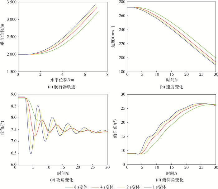针对部分变体航行器变体描述复杂、存在刚体与柔性体耦合导致动力学模型复杂的问题,推导了一种具有普遍适用性的变体航行器动力学方程。将航行器视为由质点组成的整体,建立每个质点的运动微分方程。采用积分思想得到了适用于变体航行器的动力学扩展方程,其中,航行器变体产生的影响可以用附加力与附加力矩描述。对一种具有柔性翼的共形半环翼变体航行器进行了纵向面内开环运动仿真。针对部分附加力与附加力矩难以准确计算的问题,提出了一种便于工程化快速计算的方法,分析了不同变体速率下航行器的动力学响应和附加力、附加力矩的影响。结果表明,附加力和附加力矩与变体速率正相关。