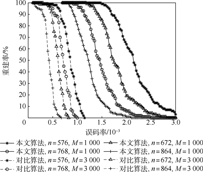 为了改善高误码率情况下低密度奇偶校验(LDPC)码稀疏校验矩阵重建算法的性能,基于迭代译码的思想提出了一种稀疏校验矩阵的重建算法。首先,利用对偶空间算法获取到部分非稀疏校验向量,并对其进行稀疏化处理。其次,利用稀疏化后的校验向量对LDPC码进行软判决迭代译码,从而对码字中错误比特进行纠正,以改善码字质量。然后,对纠错后码字再次进行校验向量获取,不断重复迭代。最后,实现LDPC码稀疏校验矩阵的重建。实验结果表明:在误码率为10-3量级下,针对IEEE802.16e、IEEE802.11n等协议下的LDPC码,所提算法均能有效完成重建,同时新算法的稀疏矩阵重建率要明显好于传统方法。