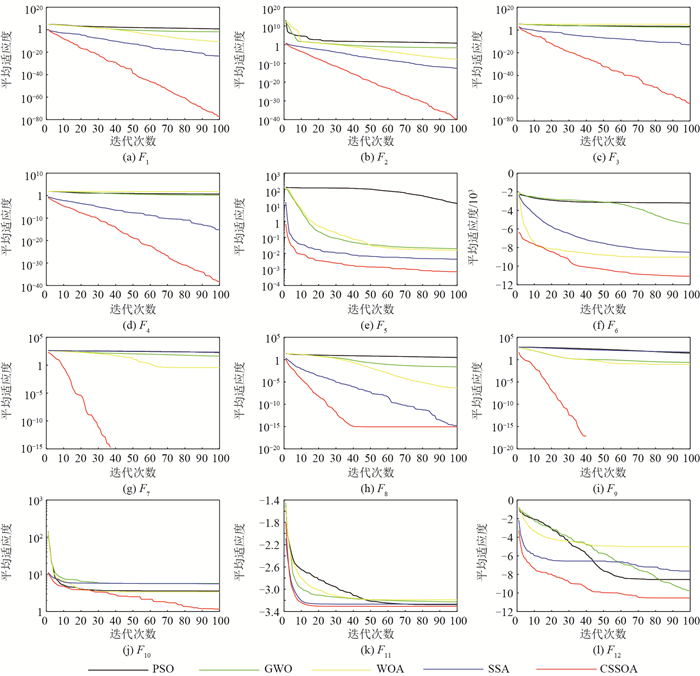 类型 函数 PSO GWO WOA SSA CSSOA 平均值 标准差 平均值 标准差 平均值 标准差 平均值 标准差 平均值 标准差 高维单峰 F1 5.073 1.718 1.587×10-2 9.820×10-3 3.136×10-11 8.830×10-11 3.757×10-24 2.058×10-23 6.186×10-78 3.195×10-77 F2 6.920 2.727 2.516×10-2 9.797×10-3 1.637×10-8 4.417×10-8 1.673×10-13 7.279×10-13 1.745×10-40 4.160×10-40 F3 1.429×103 6.541×102 2.654×10-2 2.405×102 1.019×105 2.836×104 6.526×10-14 3.313×10-13 3.292×10-65 1.283×10-64 F4 5.159 1.412 1.503 6.449×10-1 6.399×10 2.410×10 6.980×10-16 3.278×10-15 5.188×10-39 2.247×10-38 F5 1.271×10 9.092 1.935×10-2 8.231×10-3 1.579×10-2 1.533×10-2 4.250×10-3 4.383×10-3 7.229×10-4 6.384×10-4 高维多峰 F6 -3.211×103 4.485×102 -5.466×103 9.532×102 -9.034×103 1.675×103 -8.513×103 6.873×102 -1.109×104 7.128×102 F7 1.896×102 4.051×101 4.288×101 1.779×10 3.923×10-1 1.271 2.266×102 3.867×10 0 0 F8 3.035 3.845×10-1 2.553×10-2 9.419×10-3 4.154×10-7 6.556×10-7 1.480×10-15 1.885×10-15 8.882×10-16 0 F9 2.977×101 8.579 2.474×10-1 1.233×10-1 8.940×10-2 2.365×10-1 4.736×10 5.372×10 0 0 低维多峰 F10 3.565 2.217 5.700 4.123 3.396 2.921 5.552 5.217 1.164 5.265×10-1 F11 -3.274 5.924×10-2 -3.228 8.406×10-2 -3.190 8.603×10-2 -3.267 6.033×10-2 -3.306 4.111×10-2 F12 -8.554 3.376 -9.778 2.227 -5.023 2.705 -7.647 2.738 -1.054×10 1.281×10-5 表 3 基准函数的优化结果比较