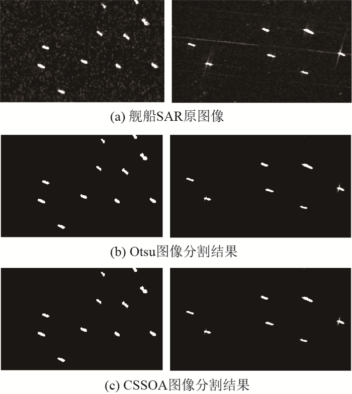 函数 PSO GWO WOA SSA CSSOA 迭代次数 时间/s 迭代次数 时间/s 迭代次数 时间/s 迭代次数 时间/s 迭代次数 时间/s F1 100 0.033 100 0.061 100 0.190 95 0.128 6 0.021 F2 100 0.024 100 0.048 100 0.185 100 0.118 6 0.011 F3 100 0.193 100 0.225 100 0.351 100 0.417 7 0.054 F4 100 0.033 100 0.058 100 0.192 100 0.137 6 0.018 F5 100 0.035 100 0.061 100 0.192 100 0.139 4 0.014 F6 100 0.027 100 0.045 100 0.184 100 0.121 3 0.011 F7 100 0.036 100 0.068 100 0.196 42 0.067 5 0.024 F8 100 0.042 100 0.068 100 0.199 100 0.151 6 0.023 F9 100 0.049 100 0.073 100 0.206 41 0.066 5 0.017 F10 77 0.177 89 0.227 69 0.173 100 0.480 5 0.040 F11 82 0.036 85 0.055 98 0.087 100 0.174 9 0.027 F12 97 0.080 100 0.106 100 0.120 100 0.230 4 0.019 表 4 图像分割阈值