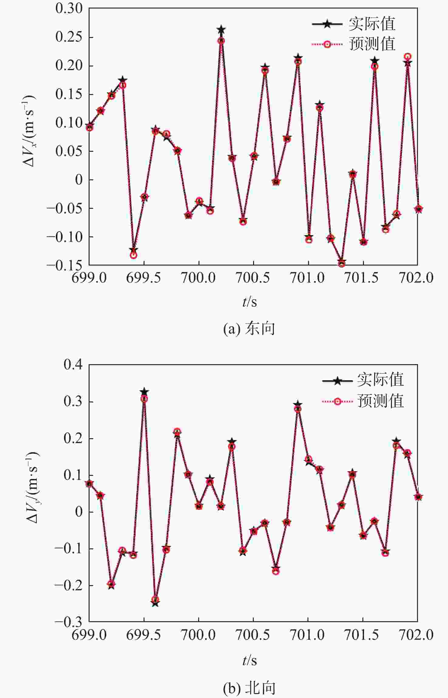 m 双测状态 经度 纬度 高度 均值 SD 均值 SD 均值 SD 卫星正常 0.20818 1.0587 −0.25183 1.19667 −0.37409 1.21927 卫星不足 −6.85383 14.33106 −0.98421 4.06205 −6.51393 13.87575 观测量预测 0.81243 2.37502 −0.72929 1.89076 0.25046 1.31343 表 4 380~410 s速度误差统计
