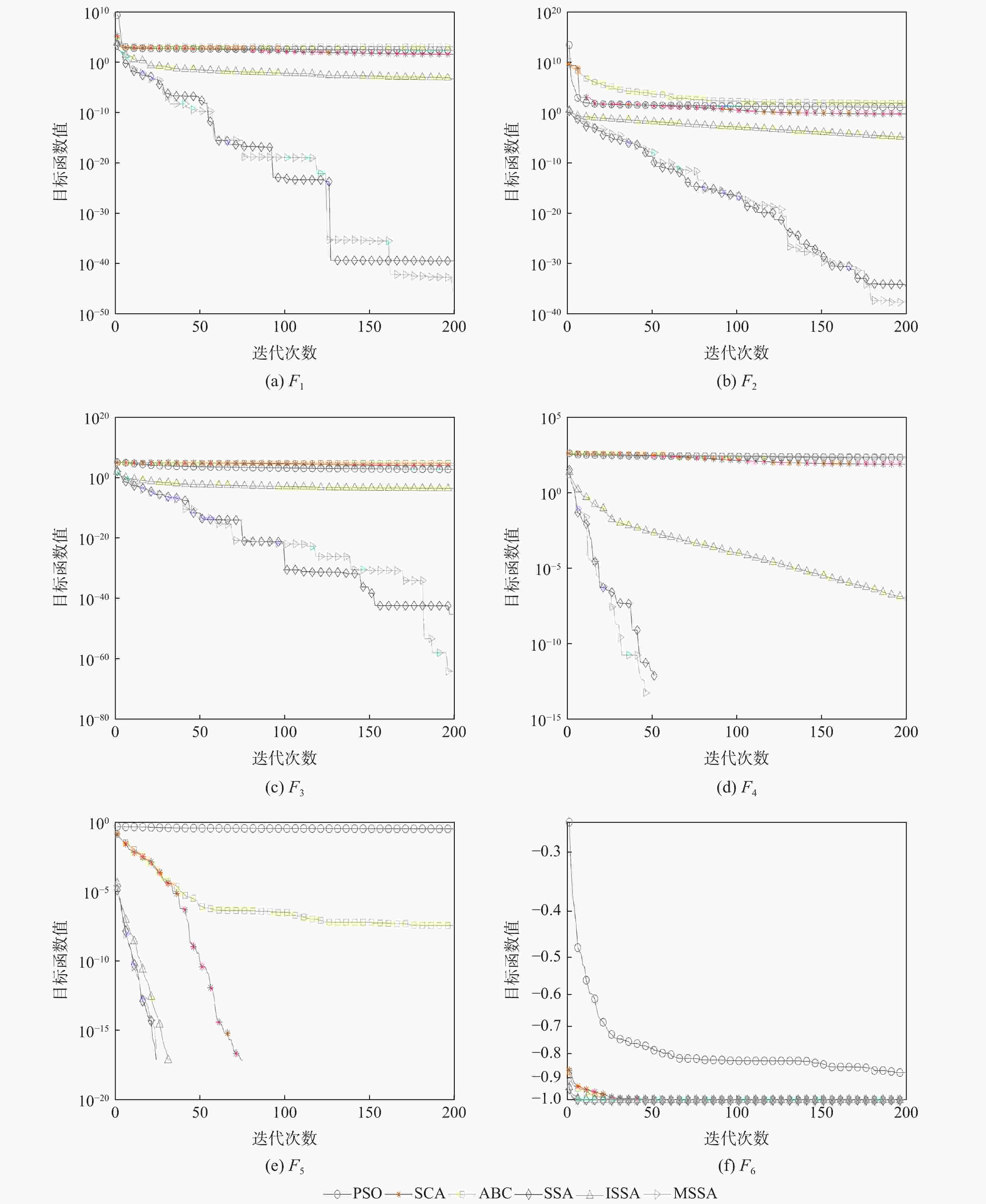 算法 参数设置 PSO $ {w_{\max }} = 0.9,{w_{\min }} = 0.2,{c_1} = 2,{c_2} = 2 $ SCA $a = 2,{r_2} \in [0,2\text{π} ],{r_3} \in [ - 2,2],{r_4} \in [0,1]$ ABC L = round (0.6dP), a=1 SSA $ {\rm{PD}} = 35,{\rm{ST}} = 0.6,{\rm{SD}} = 70 $ ISSA ${\rm{PD} } = 35,{\rm{ST}} = 0.6,{\rm{SD} } = 70$ MSSA ${\rm{PD} } = 35,{\rm{ST} } = 0.6\left(\dfrac{1}{ {1 + { {\rm{e} }^{t/10 - 20} } } }\right),{\rm{SD} } = 70$ 表 3 算法性能对比