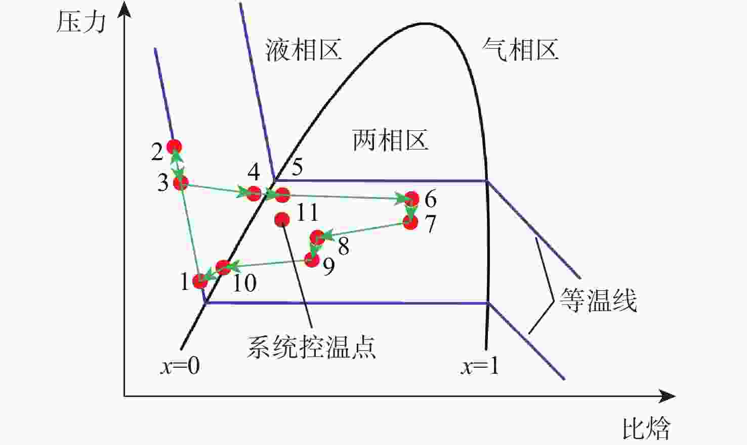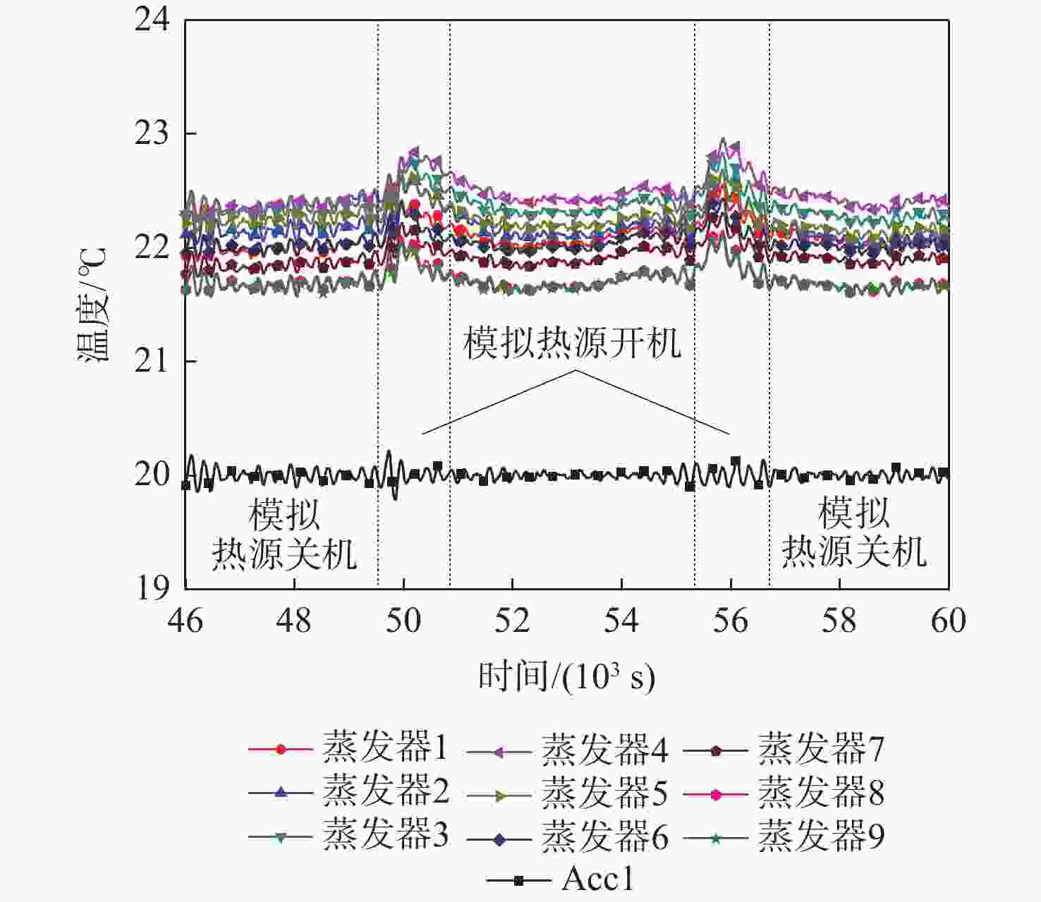 参数 数值 两相管路直径/mm 外径4.0,内径3.0 单相管路直径/mm 外径3.175,内径2.06 管路总长度/m 20.0 辐射冷凝器 面积0.32 m2;发射率0.86 储液器体积/L 0.53 冷凝器控温功率/W 20.0 预热器功率/W 40.0 蒸发器功率/W 45.0 表 2 外热流随时间周期变化值
