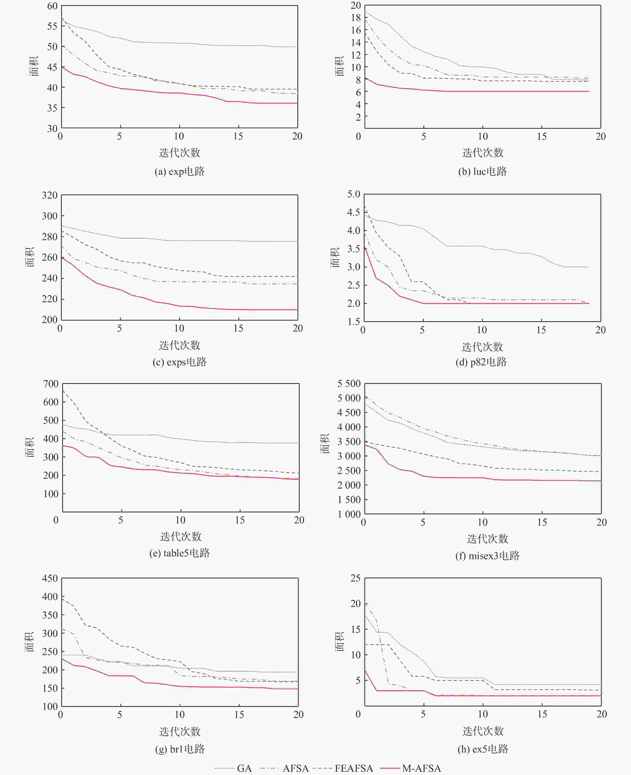 MCNC In GA HGA AFSA FEAFSA M-AFSA S1/% S2/% S3/% S4/% p82 5 2 2 2 2 2 0 0 0 0 pope 6 37 37 37 37 37 0 0 0 0 inc 7 18 18 18 18 18 0 0 0 0 luc 8 6 6 6 6 6 0 0 0 0 exps 8 223 204 204 204 204 8.52 0 0 0 newxcpla1 9 29 28 28 28 28 3.45 0 0 0 prom2 9 84 36 36 36 36 57.14 0 0 0 br1 12 175 156 117 117 117 33.14 25.00 0 0 misex3 14 2215 2079 2415 2079 2079 6.14 0 13.91 0 table3 14 3873 3522 2538 2784 2538 34.47 27.94 0 8.84 table5 17 201 201 2 158 145 27.86 27.86 0 8.23 表 2 平均面积与平均时间数据