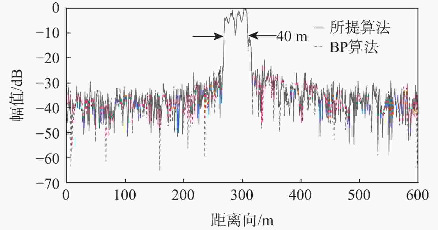参数 距离向 方位向 PSLR/dB ISLR/dB 分辨率/m PSLR/dB ISLR/dB 分辨率/m 目标13 −34.8 −12.8 16.8 −13.3 −9.94 5.625 目标25 −34.8 −12.6 16.8 −13.11 −9.76 5.626 理论值 −35 −12.8 16.3 −13.3 −9.95 5.625 表 5 实验场景主要回波目标