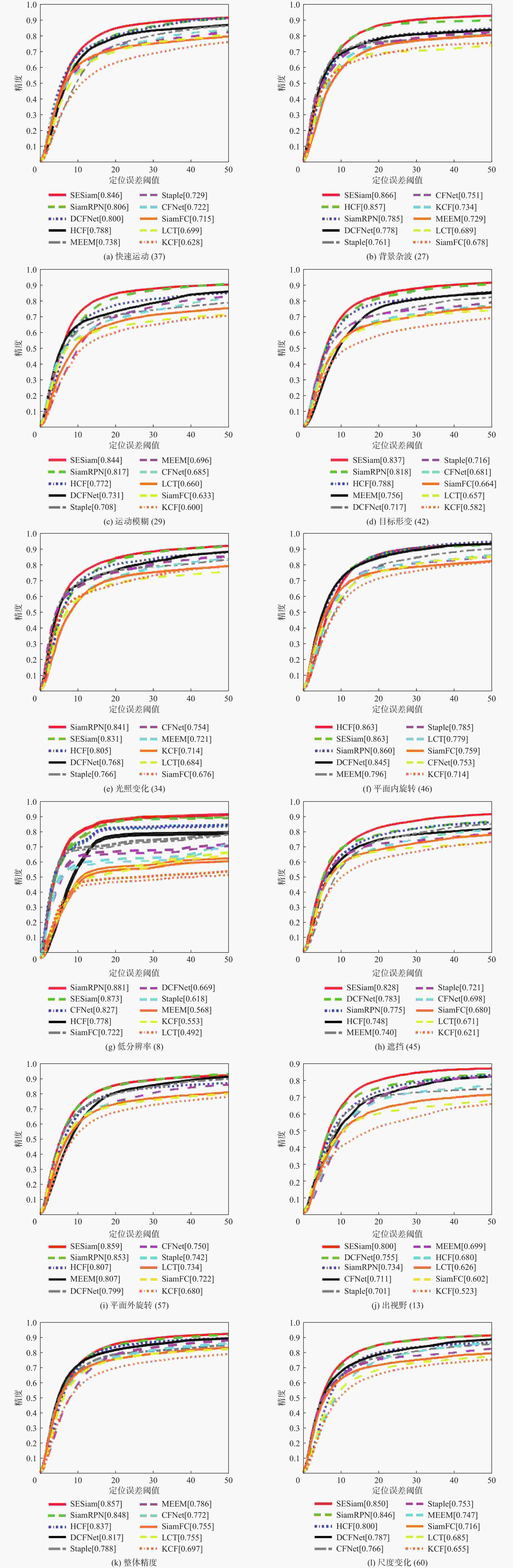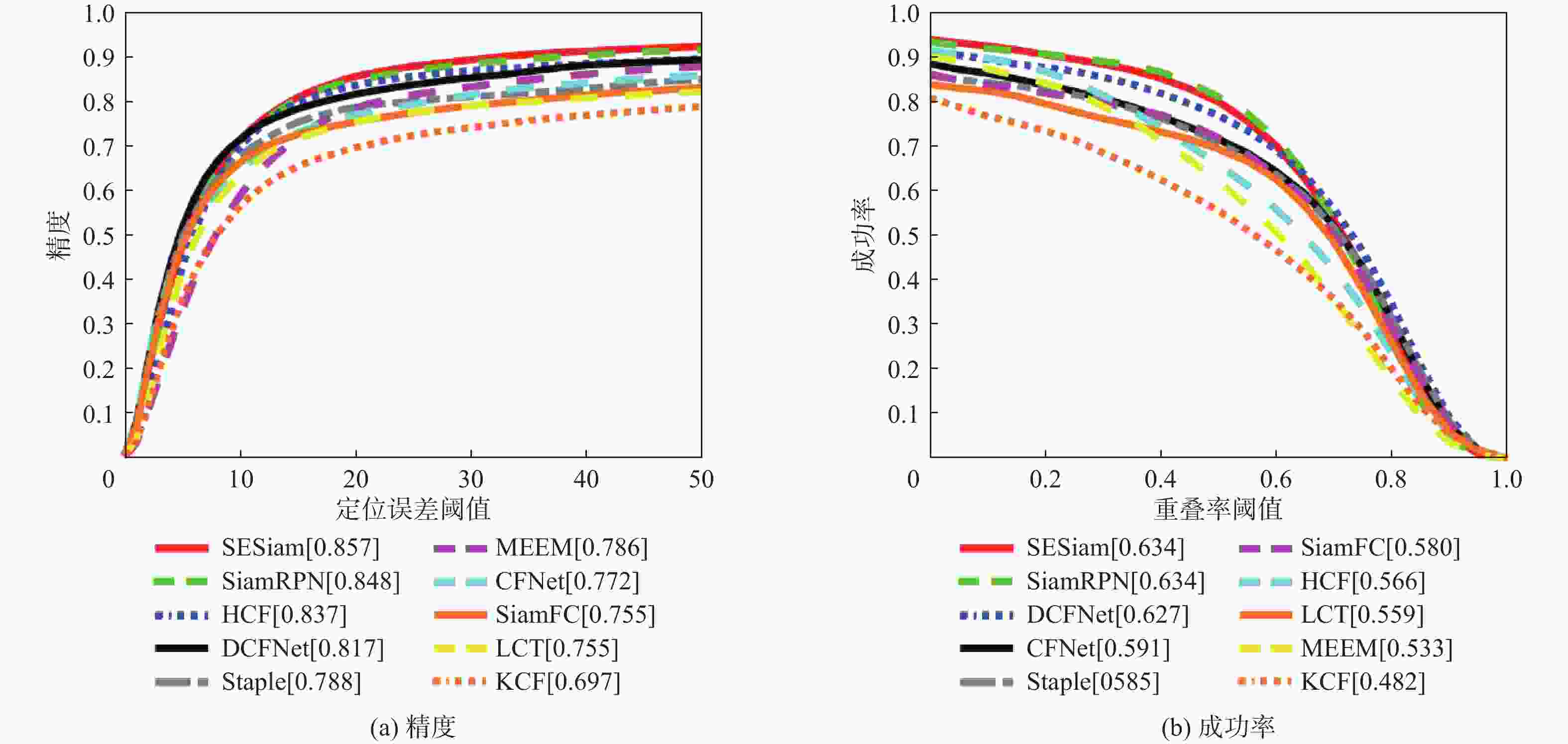 算法 精度 成功率 跟踪速度/fps SESiam 0.857 0.634 86 SiamRPN 0.848 0.634 160 GradNet 0.861 0.639 80 CFNet 0.772 0.591 78.4 SASiam 0.849 0.641 50 DCFNet 0.817 0.627 65.9 SiamFC 0.755 0.580 83.7 注:fps为帧/s。 -