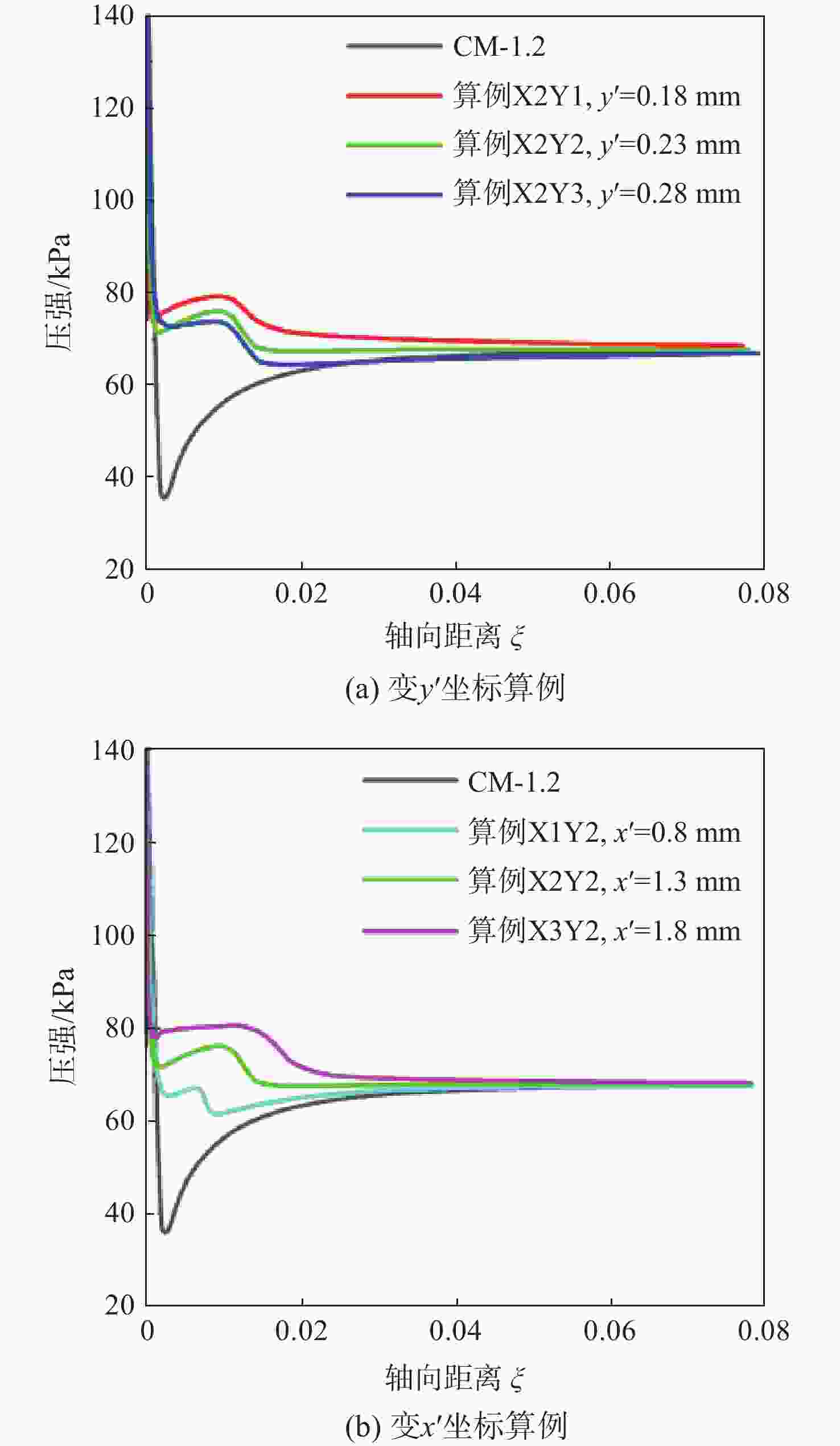 算例名 x′/mm y′/mm 降噪效果/dB 算例X2Y1 1.3 0.18 1.63 算例X2Y2 1.3 0.23 0.25 算例X2Y3 1.3 0.28 0 算例X1Y2 0.8 0.23 −0.1 算例X3Y2 1.8 0.23 0.70 -
