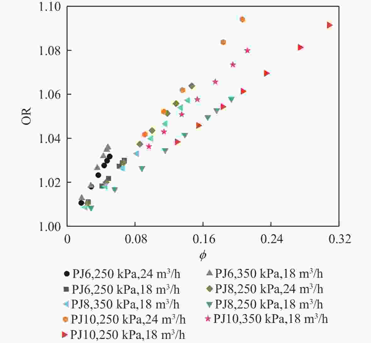 18 m3/h358.1 29.4 0.38 20.1 1696.9 1.0128 354.1 29.2 0.61 18.1 1697.1 1.0184 347.5 30.0 0.78 16.8 1754.4 1.0263 345.8 29.9 0.93 16.5 1761.4 1.0320 352.1 29.6 1.03 15.7 1748.1 1.0345 345.5 29.9 1.05 15.5 1767.1 1.0359 表 4 不同工况下的液滴粒径及过读特性 (PJ8)