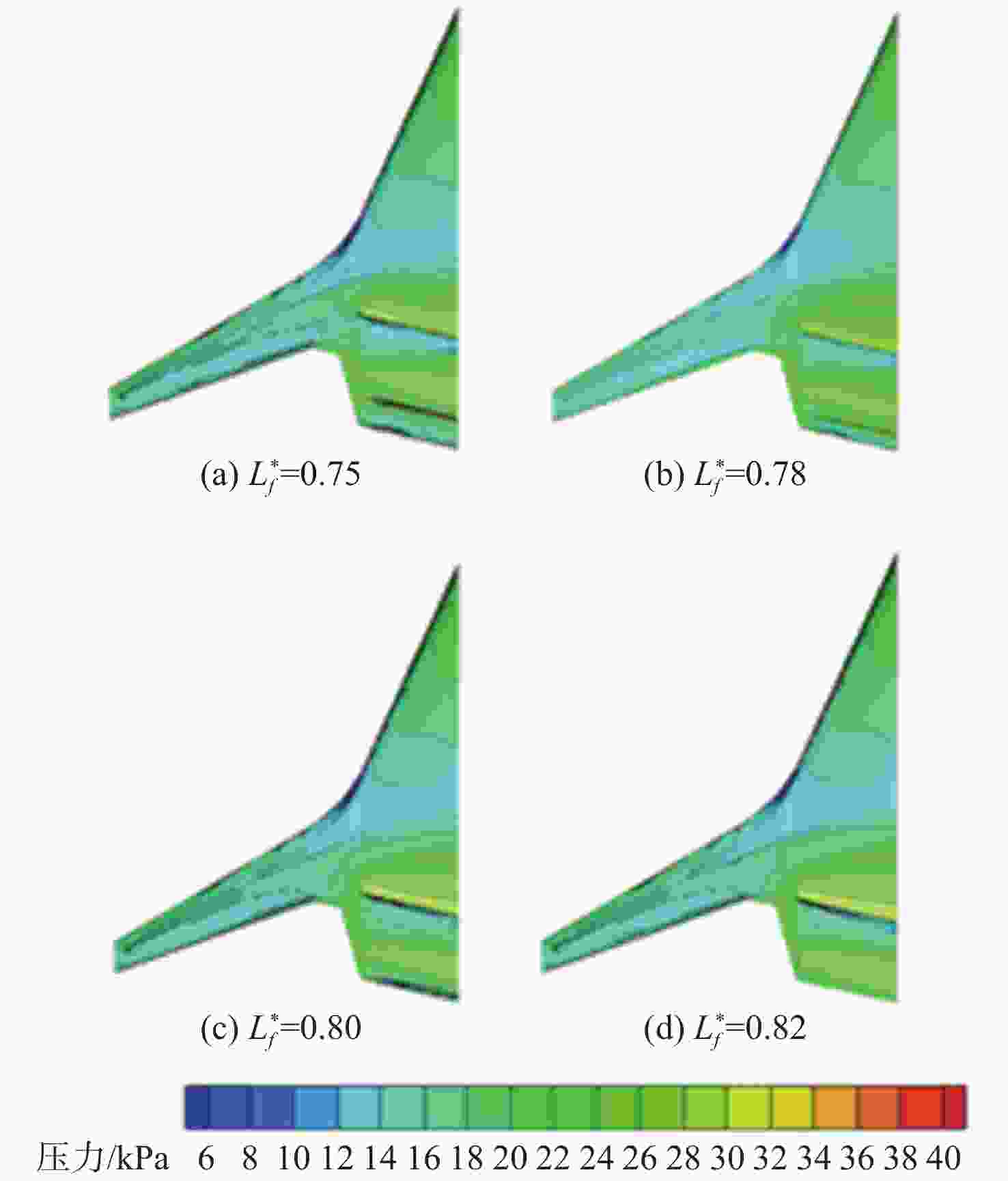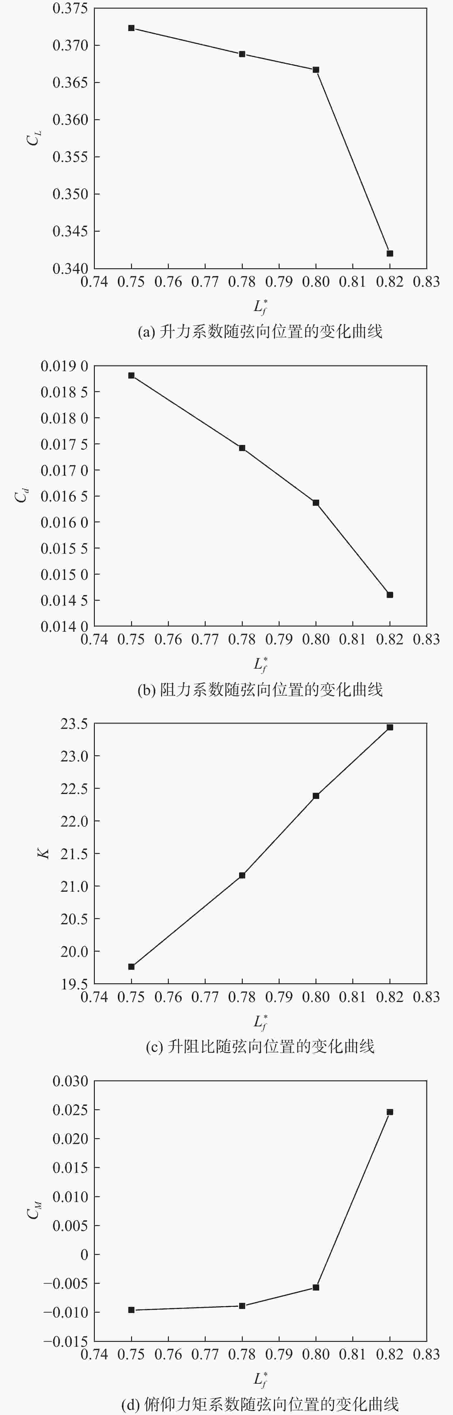 构型$L^*_f $ CL Cd CM K 0.75 0.3723 0.01883 −0.0095 19.77 0.78 0.3688 0.01742 −0.0090 21.18 0.80 0.3668 0.01638 −0.0056 22.39 0.82 0.3421 0.01459 0.0249 23.45 表 11 动力系统不同展向布置方案计算结果