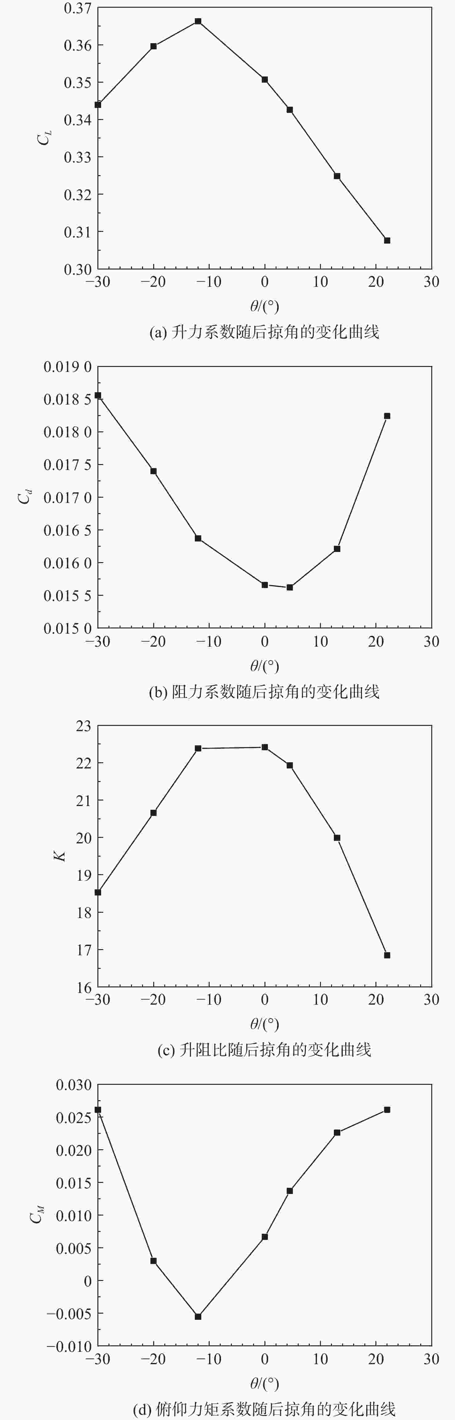 构型 CL Cd CM K Case0 0.3620 0.01660 0.0071 21.81 Case1 0.3428 0.01561 0.0136 21.95 Case2 0.3359 0.01529 0.0190 21.98 Case3 0.3375 0.01566 0.0170 21.55 Case4 0.3413 0.01566 0.0149 21.79 Case5 0.3452 0.01583 0.0121 21.81 表 9 动力系统不同后掠角计算结果