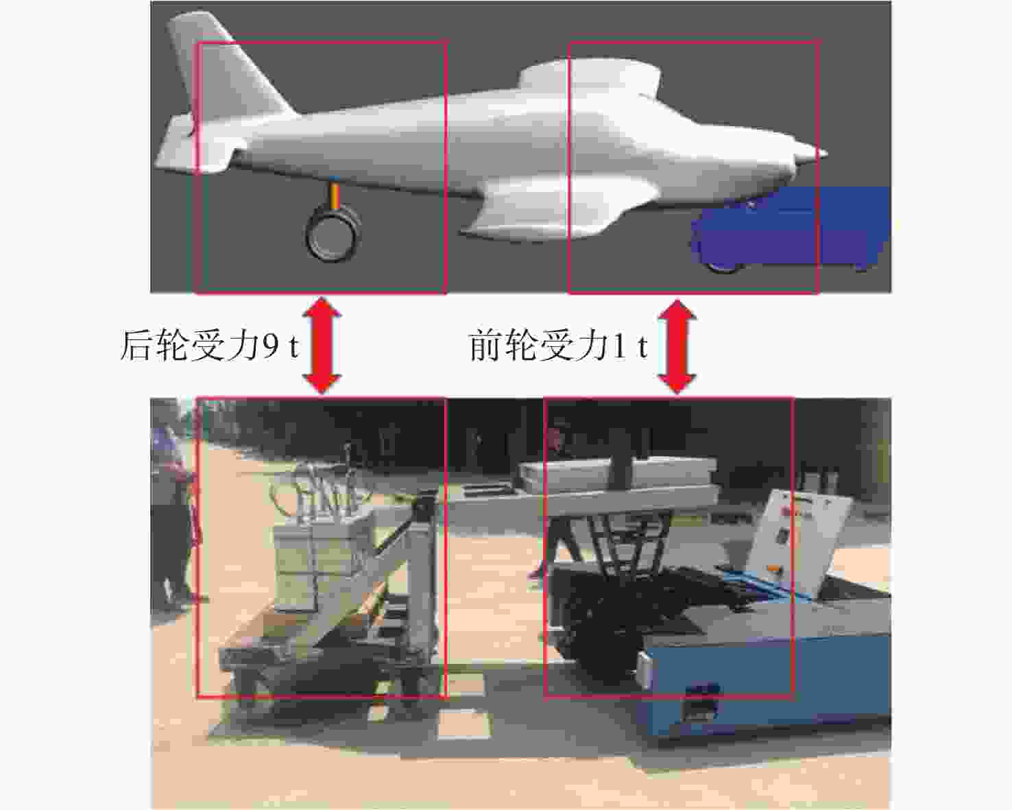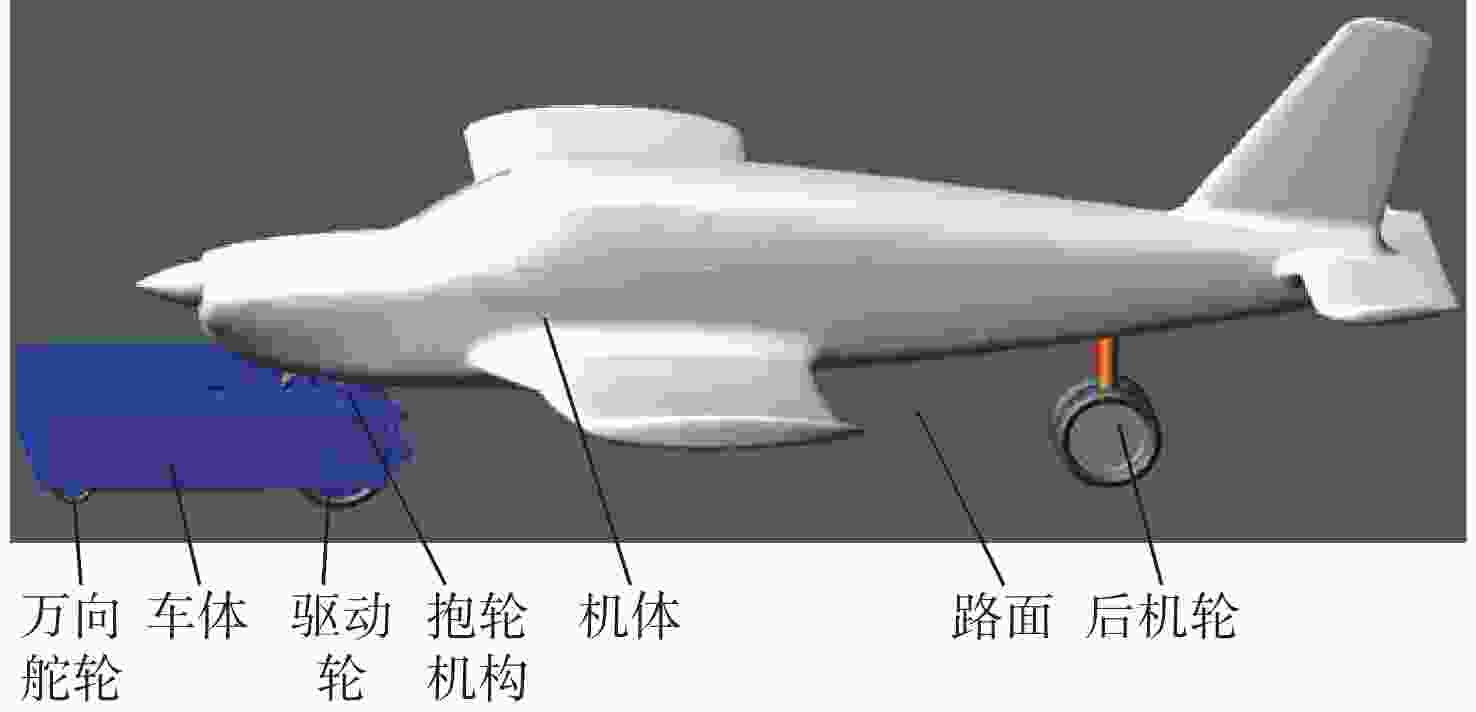项目 参数 数值 飞机 质量/kg 10000 长×宽×高/(mm×mm×mm) 12270 ×9480 ×4800 质心到后轮轴距离/mm 430 质心到前轮距离/mm 4150 质心到地面距离/mm 2 000 两后轮距离/mm 2390 牵引车 质量/kg 2 000 长×宽×高/(mm×mm×mm) 1500 ×1500 ×480质心到后轮轴距离/mm 500 质心到前轮距离/mm 920 质心到地面距离/mm 250 两后轮距离/mm 1470 表 3 电传动无杆飞机牵引车仿真和试验条件