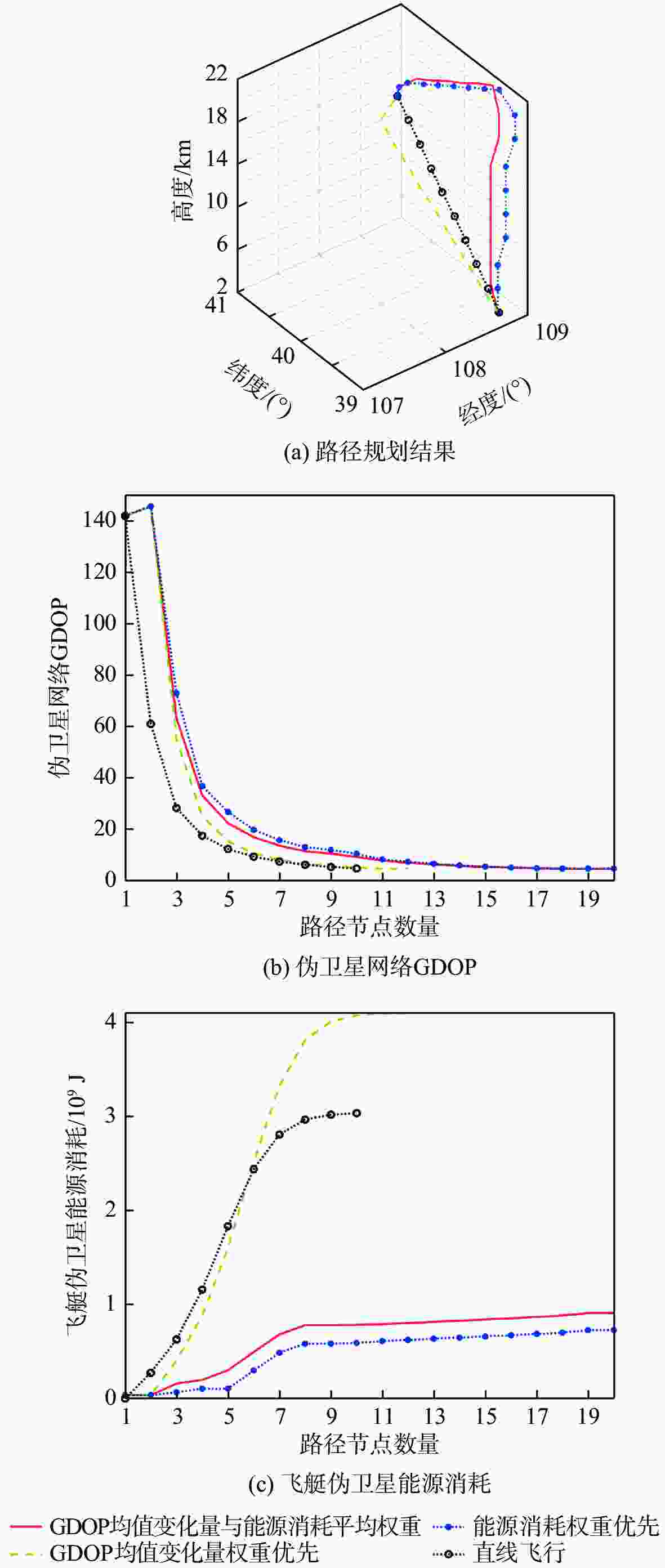 消耗平均权重9.11×108 20.18 GDOP均值变化量权重优先 4.10×109 26.09 能源消耗权重优先 7.29×108 21.67 直线飞行 3.04×109 29.46 表 2 不同飞行速度的路径规划结果性能比较