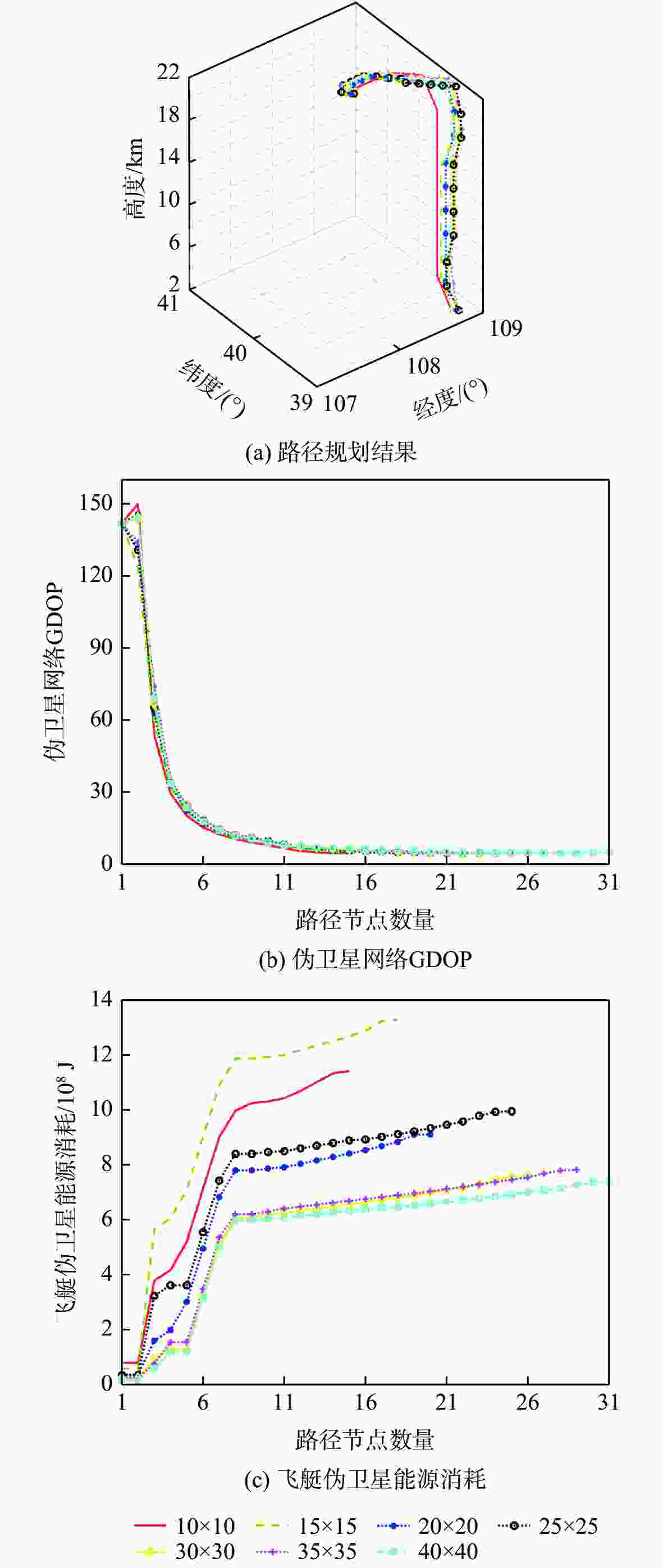 水平方向网格数量 能源消耗/J 路径GDOP均值 10×10 1.14×109 31.89 15×15 1.33×109 26.87 20×20 9.11×108 26.27 25×25 9.95×108 21.94 30×30 7.62×108 21.89 35×35 7.82×108 20.09 40×40 7.39×108 19.16 表 5 不同垂直方向网格数量的路径规划结果性能比较