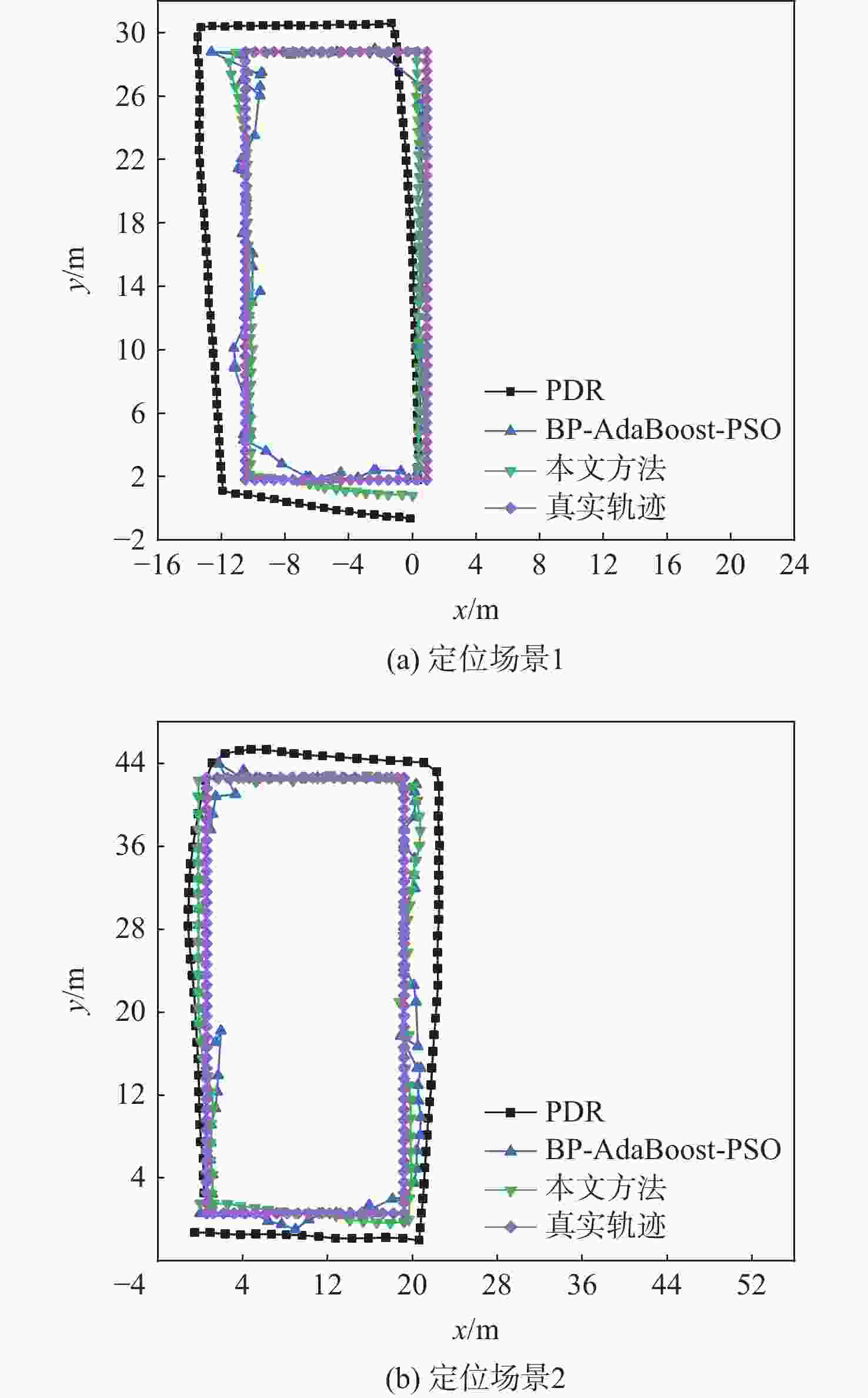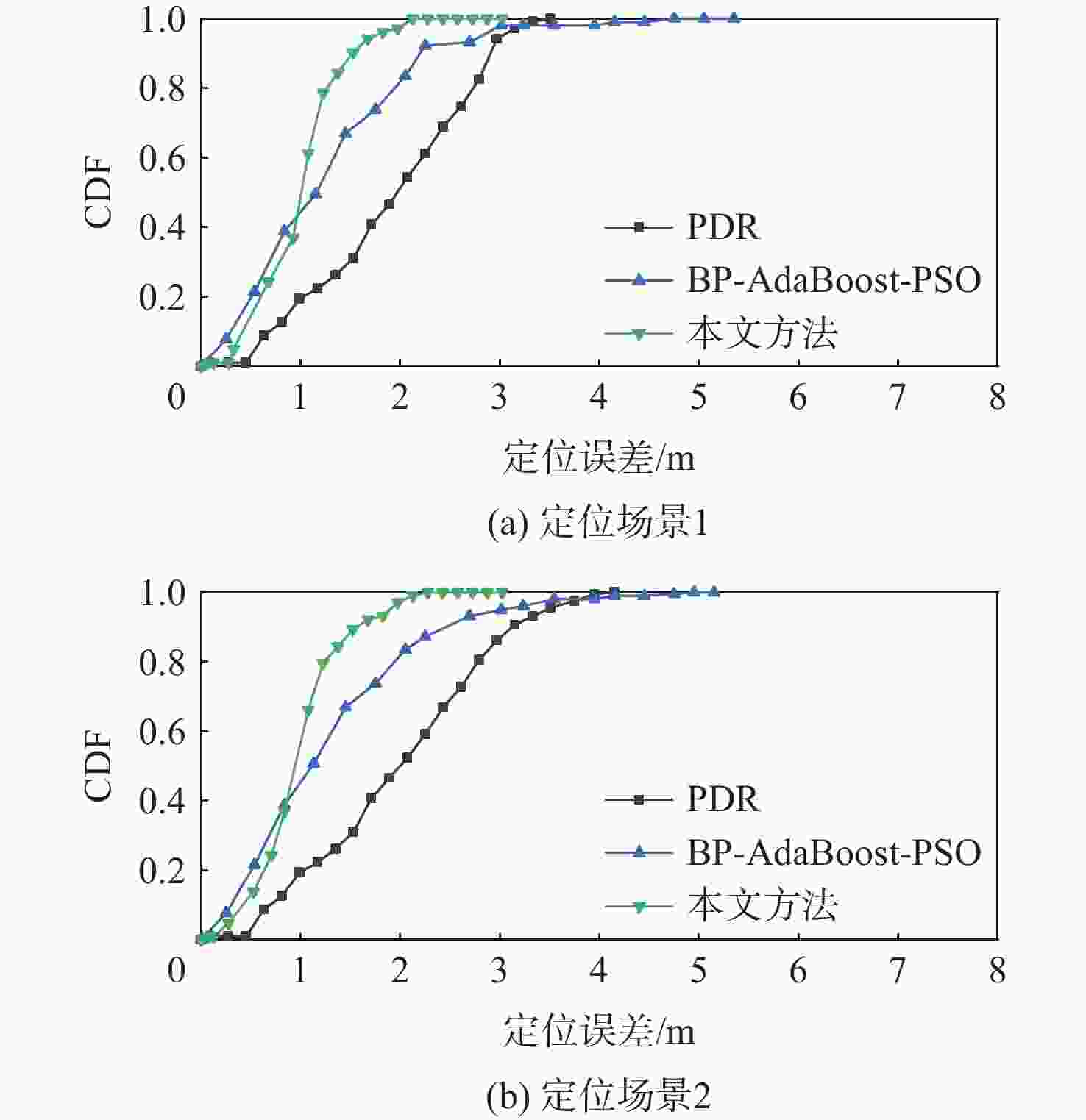 m 定位法 平均定位误差 定位场景1 定位场景2 PDR 2.56 2.61 BP-AdaBoost-PSO 1.71 1.66 本文方法 1.27 1.25 -