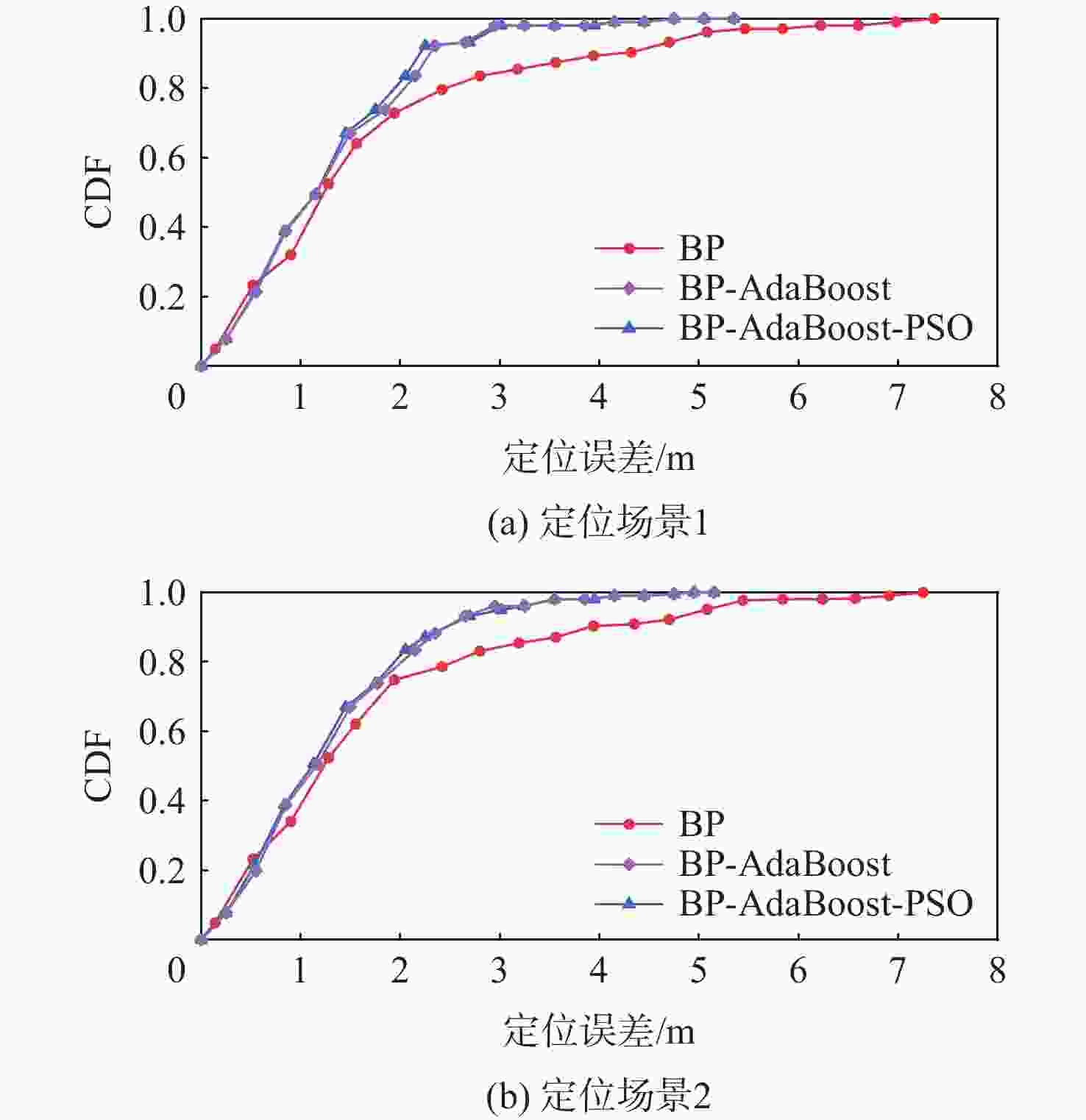 s 定位算法 平均执行耗时 定位场景1 定位场景2 BP 3.48 3.46 BP-AdaBoost 6.88 6.89 BP-AdaBoost-PSO 4.91 4.90 表 4 融合定位的平均定位误差