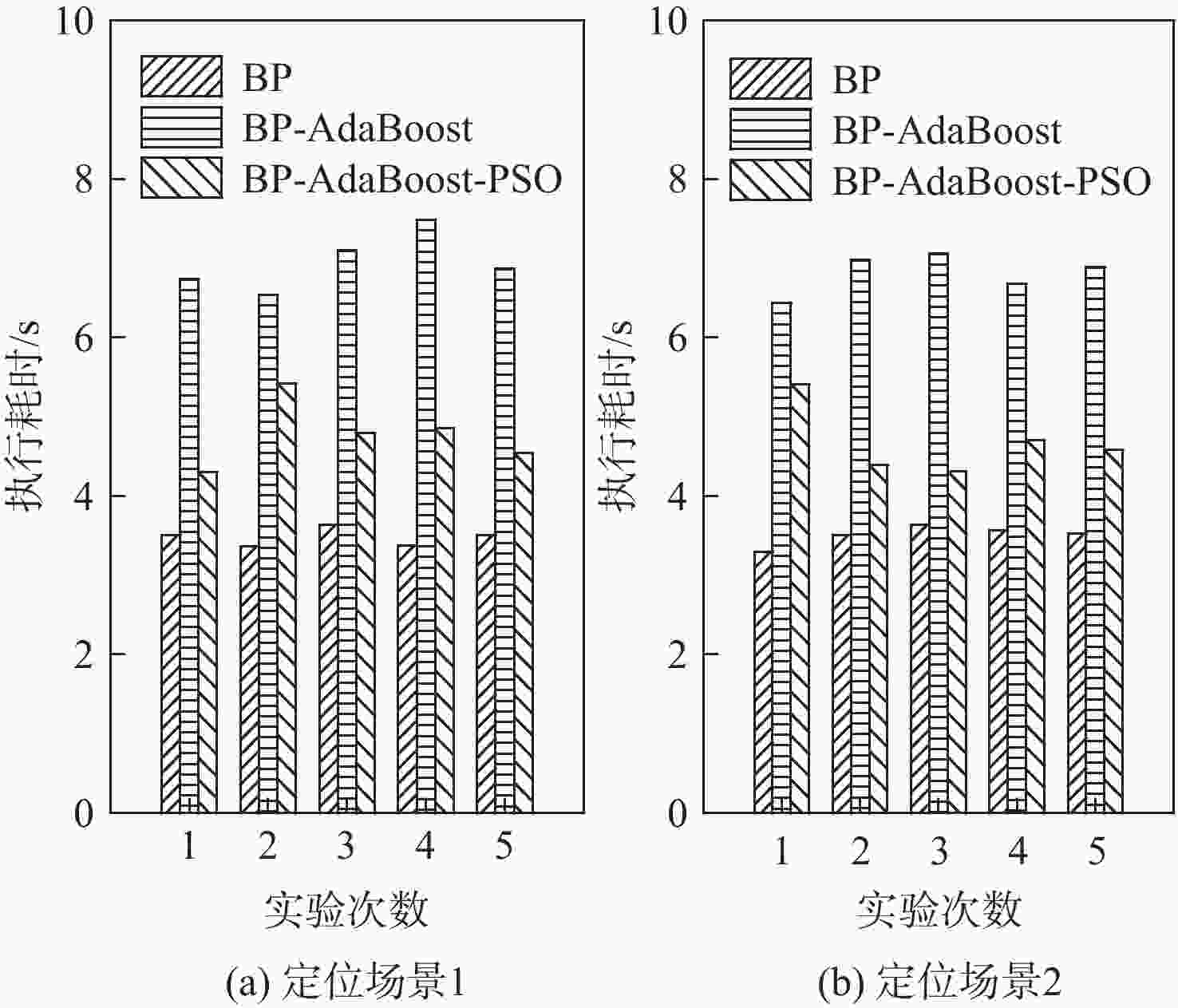 m 定位法 平均定位误差 定位场景1 定位场景2 BP 1.85 1.83 BP-AdaBoost 1.73 1.68 BP-AdaBoost-PSO 1.71 1.66 表 3 平均执行耗时