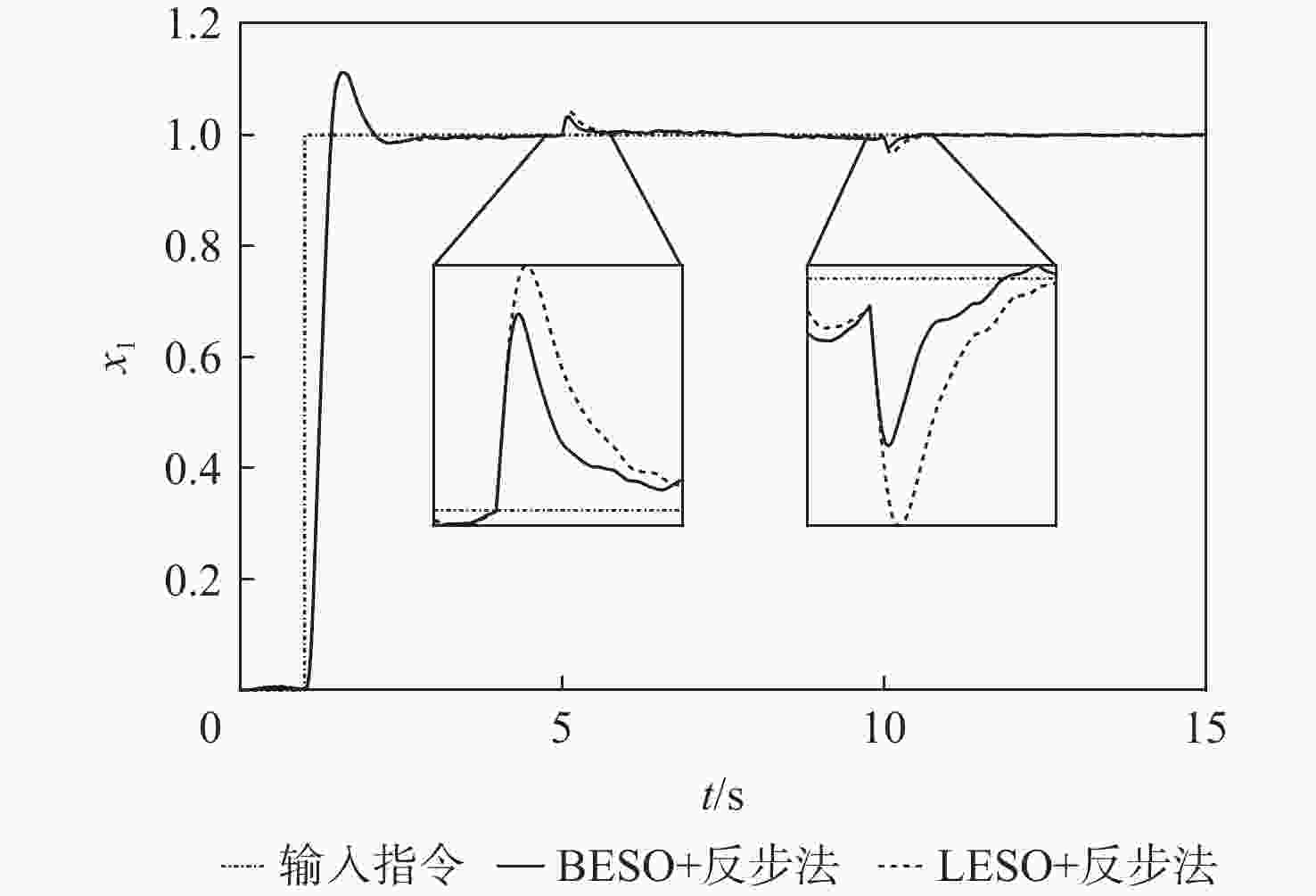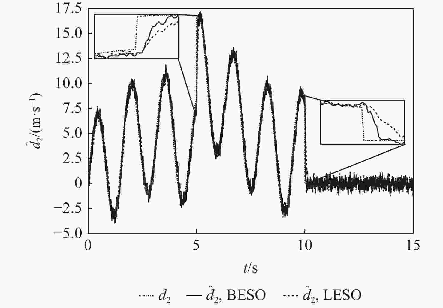${d_1}$ 估计 ${J_1}$ ${J_2}$ ${J_3}$ $\dfrac{J_{1{\rm{LESO} } } }{J_{1{\rm{BESO} } } }$/% $\dfrac{J_{2{\rm{LESO} } } }{J_{2{\rm{BESO} } } }$/% $\dfrac{J_{3{\rm{LESO} } } }{J_{3{\rm{BESO} } } }$/% BESO LESO BESO LESO BESO LESO d1 0.210 0.241 0.233 0.256 0.163 0.211 114.8 109.9 129.4 d2 0.5883 0.7589 0.6893 0.9180 0.3866 0.4410 129.0 133.2 114.1 表 2 BESO与LESO实际输入性能指标