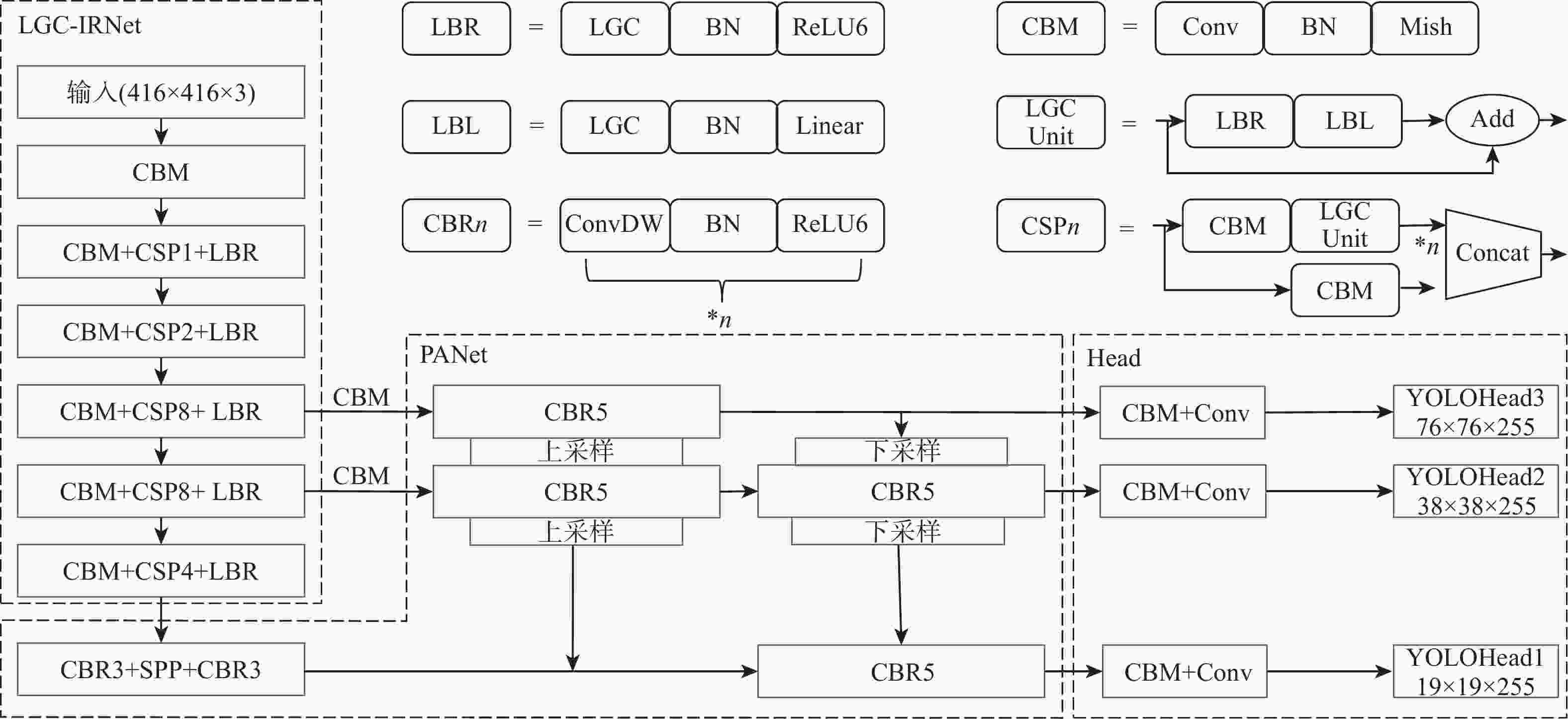 网络层次 通道数 尺寸/步长 输出 Conv2D 32 3×3/1 416×416×32 Conv2D 64 3×3/2 208×208×64 1× LGC 32 LGC 64 残差块 208×208×64 Conv2D 128 3×3/2 104×104×128 2× LGC 64 LGC 128 残差块 104×104×128 Conv2D 256 3×3/2 52×52×256 8× LGC 128 LGC 256 残差块 52×52×256 Conv2D 512 3×3/2 26×26×512 8× LGC 256 LGC 512 残差块 26×26×512 Conv2D 1024 3×3/2 13×13×1024 4× LGC 512 LGC 1024 残差块 13×13×1024 表 2 不同算法性能比较