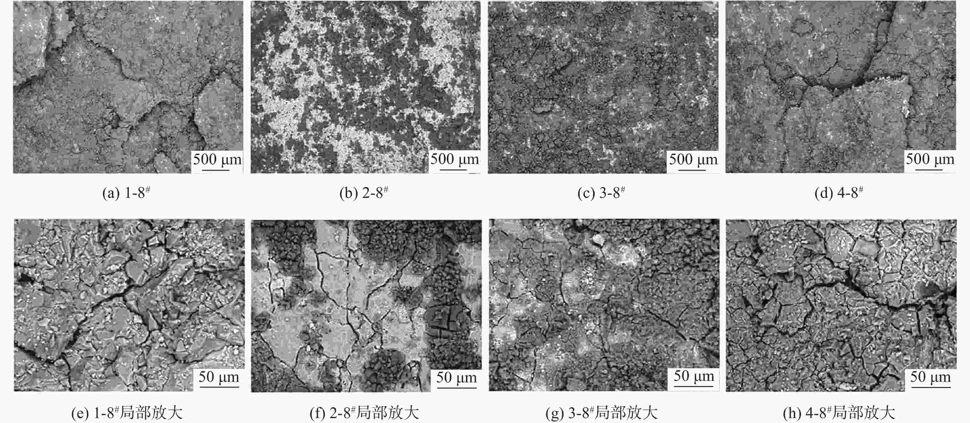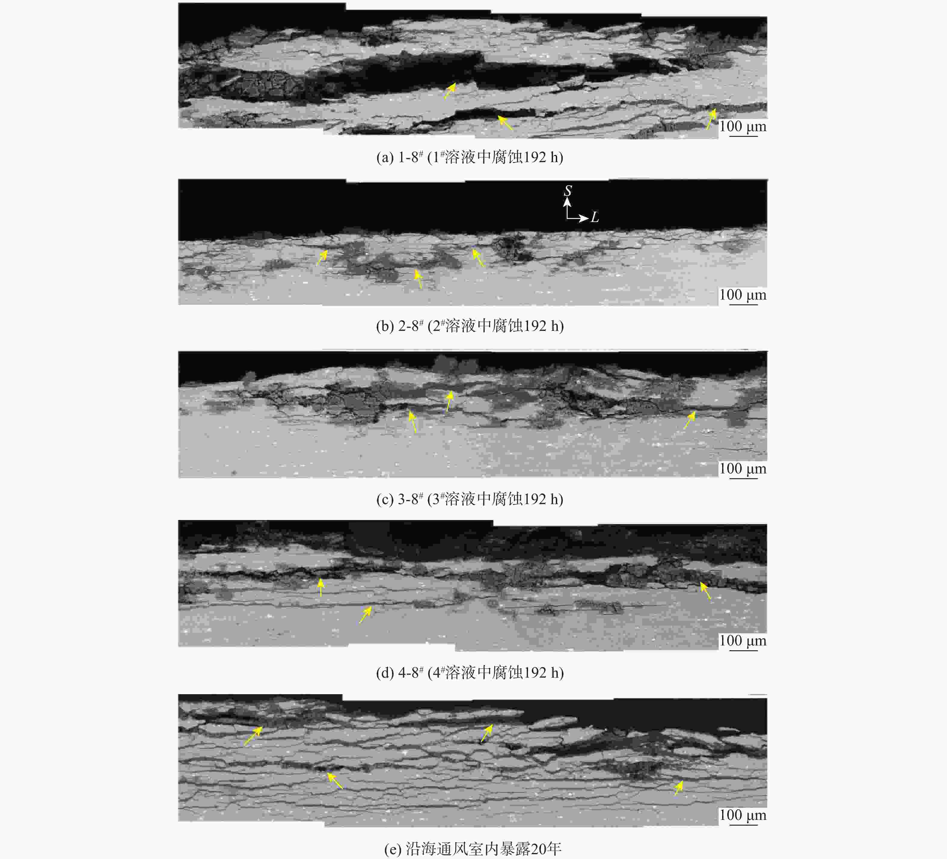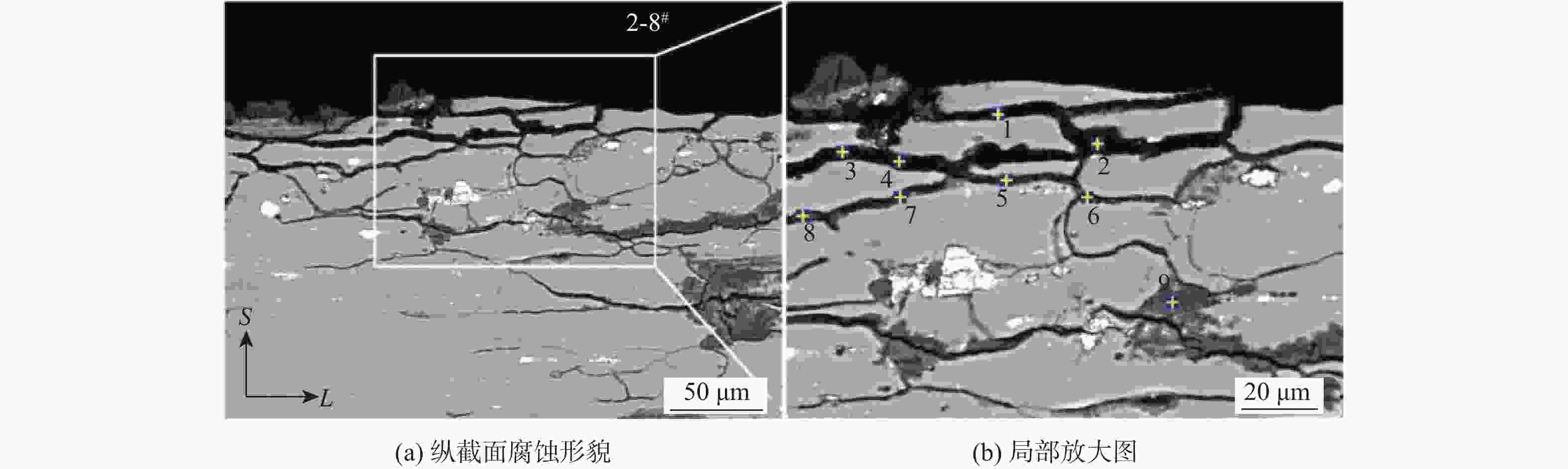 (EXCO溶液)5 1-1# 2-1# 3-1# 4-1# 24 1-2# 2-2# 3-2# 4-2# 48 1-3# 2-3# 3-3# 4-3# 96 1-4# 2-4# 3-4# 4-4# 120 1-5# 2-5# 3-5# 4-5# 144 1-6# 2-6# 3-6# 4-6# 168 1-7# 2-7# 3-7# 4-7# 192 1-8# 2-8# 3-8# 4-8# 表 5 2-8#试验件的纵截面(S-L)EDS数据