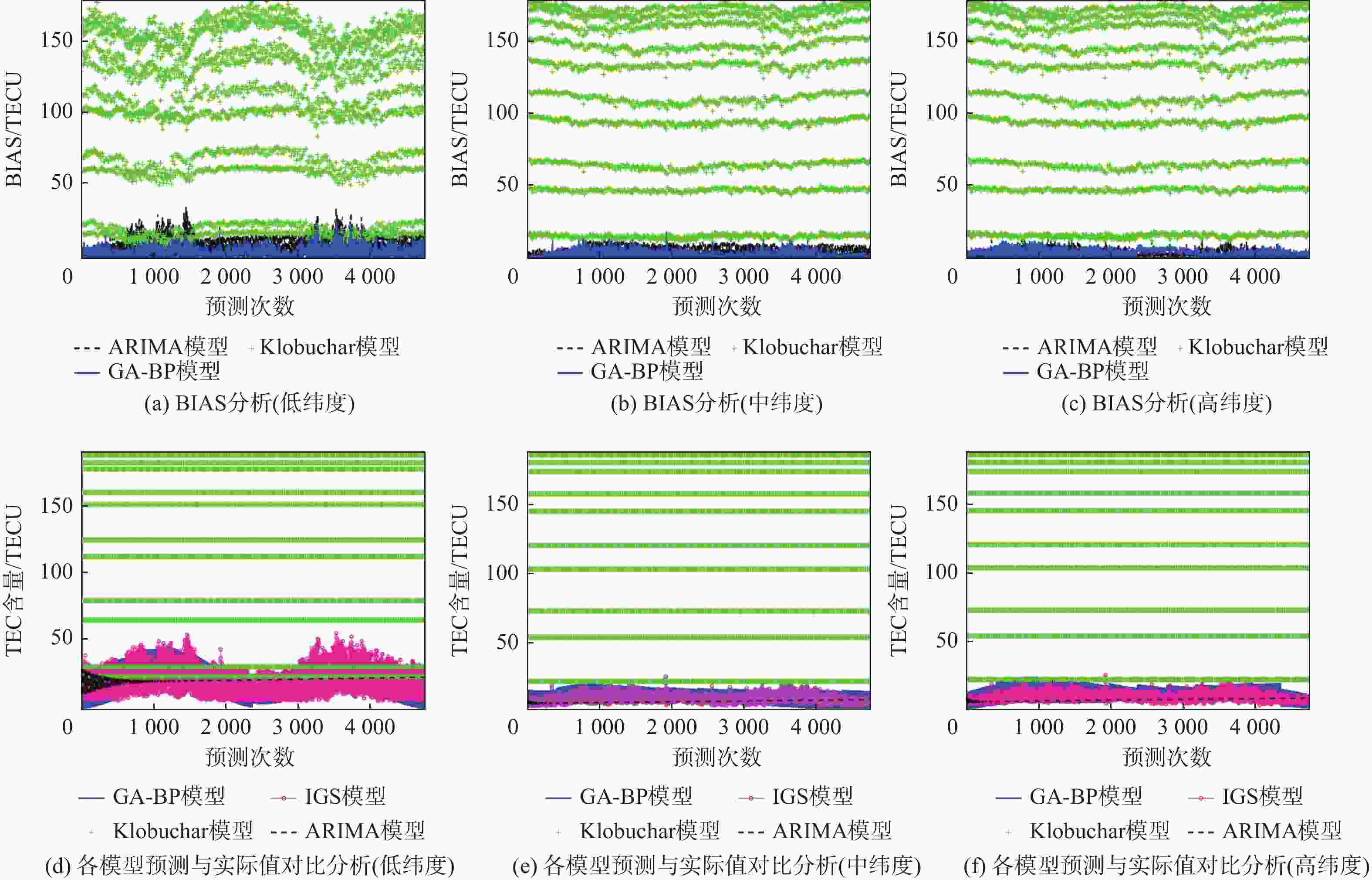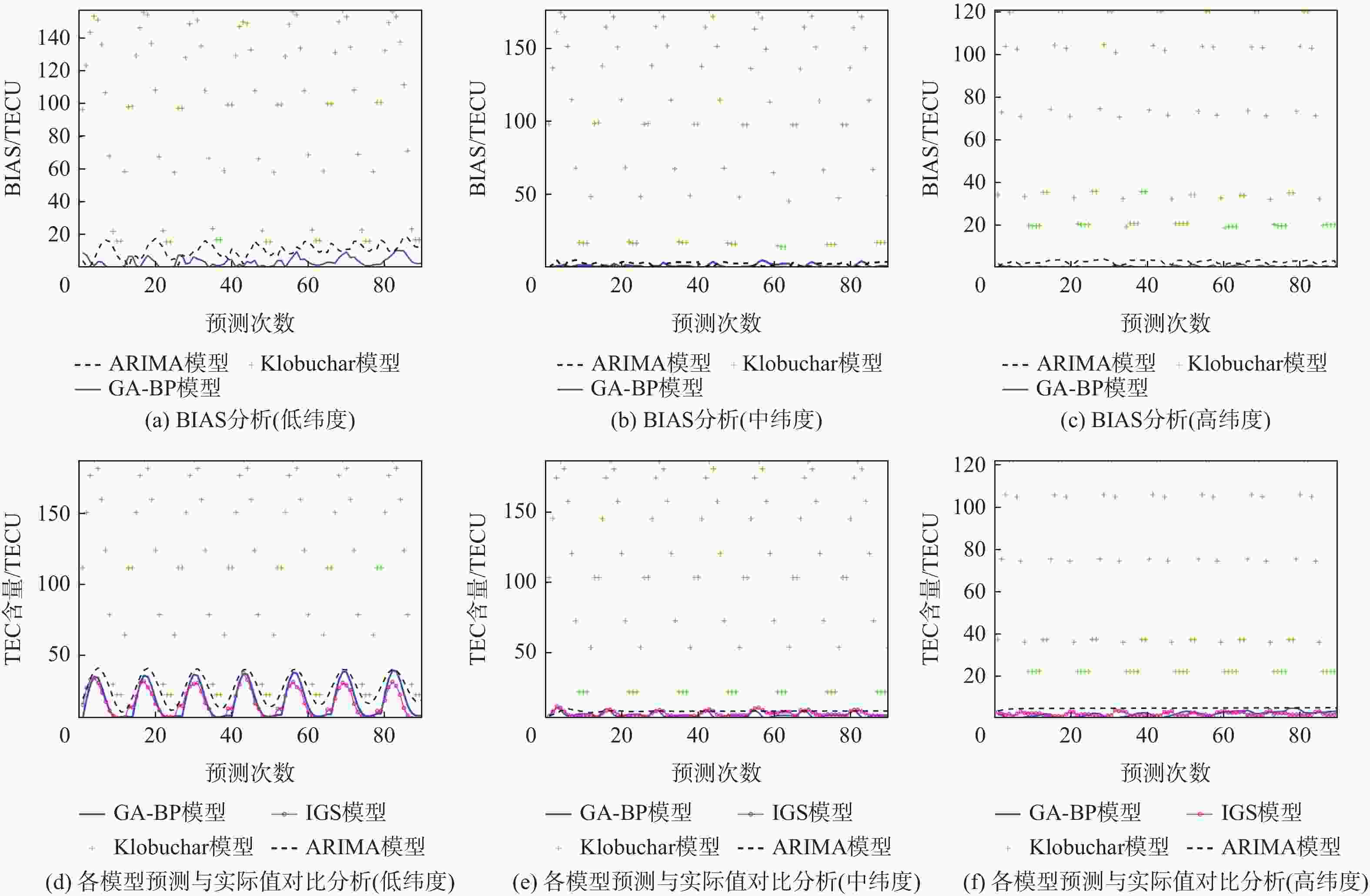 预测模型 RMSE/TECU 低纬度 中纬度 高纬度 Klobuchar 105.48 114.19 71.21 ARIMA 11.30 2.67 2.85 GA-BP 3.66 1.70 0.75 表 4 GA-BP模型短期(1周)预测精度提升率