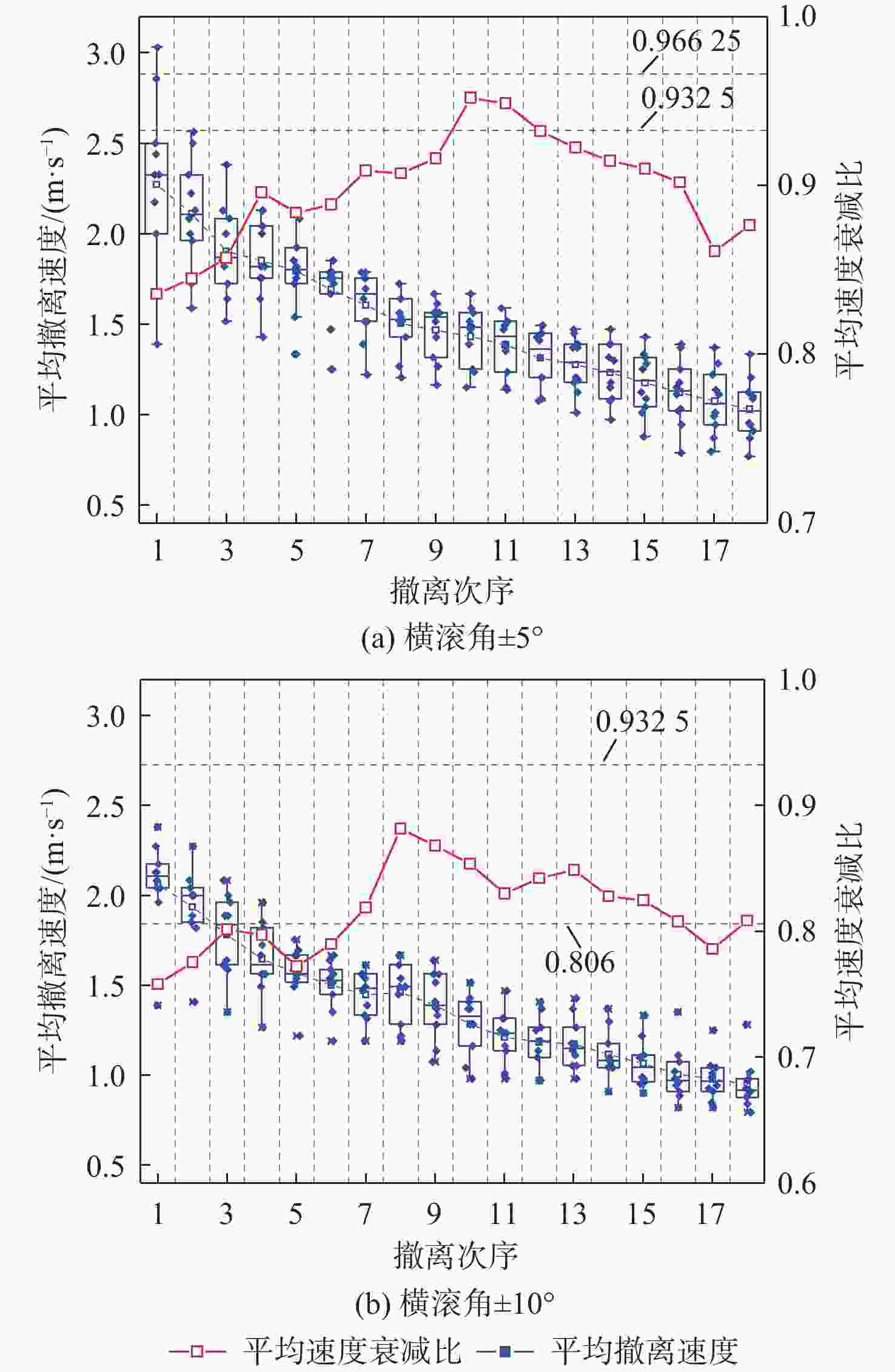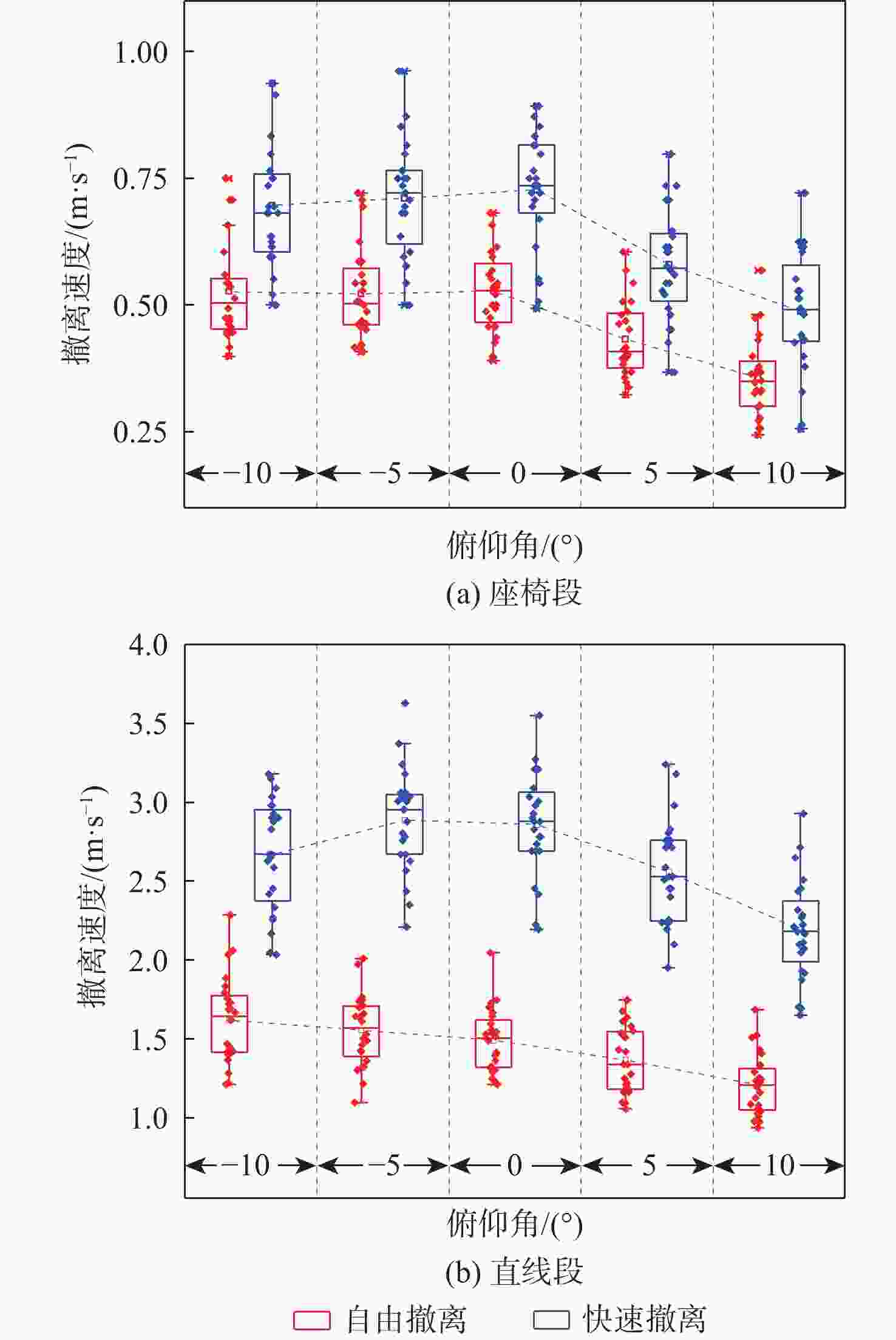 序号 姿态 俯仰角/(°) 横滚角/(°) 1 所有起落架放下 −1.25 0 2 双主起落架折断 +3.25 0 3 前起落架折断 −8.65 0 4 所有起落架折断 +2.48 0 5 前起及单个主起落架折断 +4.31 ±10.25 6 机尾过重 +12.9 0 表 2 不利姿态下的基准撤离速度