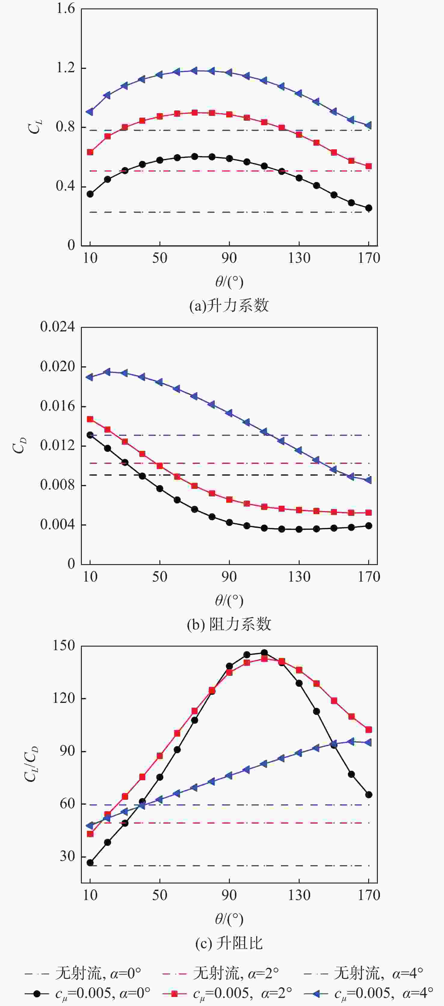 cμ CL CD CL /CD 0 0.77982 0.013095 59.55 0.0005 0.93005 0.014121 65.86 0.001 0.98081 0.014366 68.27 0.005 1.1701 0.015337 76.29 表 7 不同射流角度计算参数